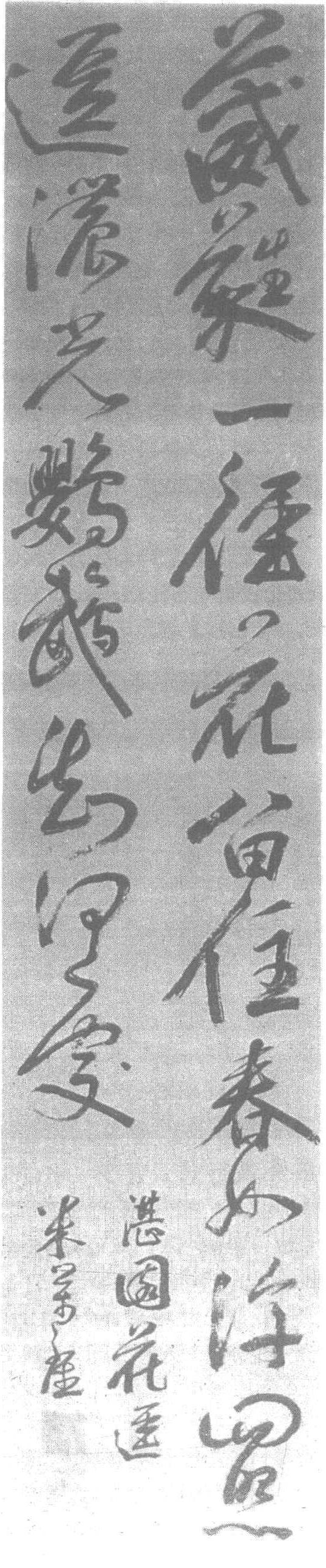明。纸本。纵167厘米,横36.4厘米。北京故宫博物院藏。米万钟(明隆庆四年—明崇祯元年,即公元1570—1628年),字仲诏,号友石,又号海淀渔长、石隐庵居士,原籍陕西安化,居顺天(今北京市)。万历二十三年(公元1595年)进士,官江西按察使。天启五年(公元1625年)被魏忠贤党人倪文焕弹劾,削籍。崇祯元年(公元1628年)复起为太常寺少卿,卒于任。生平蓄奇石甚富。又善画石花竹及山水。工行草书,得米芾法,而易其险劲秀润为浑厚朴茂,以其独有的风格称雄书坛40年,时有“南董北米”之誉。著有《篆隶考讹》。《明史稿》卷二六九有传。此幅作品,以大字行书五言诗一首,遒劲丰放,洒脱自如,是米万钟典型书风和代表作品。