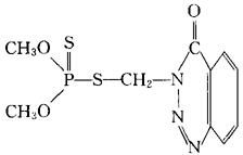 释义 | 保棉磷 又称Guthion、Bay17147、谷硫磷。 广谱性高毒杀虫杀螨剂,化学名称:O,O-二甲基-S-(4-氧代-3,4-二氢化-1,2,3-苯并三氮苯-3-甲基)二硫代磷酸酯。化学结构式如左。 纯品为无色晶体,熔点72.4℃,20℃时蒸气压1.8×106mPa。不溶于水,易溶于正己烷、二氯甲烷及2丙烷。 大鼠口服LD50为15~25mg/kg;大鼠涂皮LD50为200mg/kg。具有较强的触杀及胃毒作用。 |
