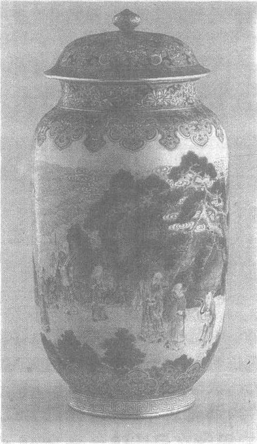 释义 | 粉彩山水人物图瓷盖罐 粉彩山水人物图瓷盖罐清嘉庆。高37.9厘米,口径12厘米。上海博物馆藏。嘉庆时粉彩器仍为主要的生产品种,前期出现了不少精品,并能保持乾隆时期的风格。此罐侈口,短颈,直腹,胫内收,圈足。盖、颈、肩、胫等处均绘绿地粉彩蕃莲纹。盖沿和圈足绘红粉回纹并描有金边。罐腹以两周如意纹做上下边框,内绘群仙祝寿图。远景是滚滚云海之中的仙山楼阁,近景群仙聚集,其旁是象征长寿的松树与鹤。笔法细腻,色彩层次丰富,是嘉庆时期的优秀作品。 ☚ 黄地粉彩龙凤纹瓷印盒 “同治年制”矾红双龙纹瓷杯 ☛ |