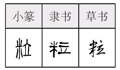 粒 金文; 篆lì[米(意符)+立(聲符)→粒(《説文》:“粒,糂也。從米,立聲。”粒,成顆的東西,細小的固體:米粒。鹽粒:基本粒子:物理學上指構成物體的最簡單的物質。)] [唐] 李紳《憫農二首》:“誰知盤中餐,粒粒皆辛苦。” 粒lì(11画)