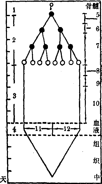 粒细胞发生和分布动力学示意图1.干细胞库 2.增殖库 3.成熟储存库 4.功能库 5.原粒细胞 6.早幼粒细胞 7.中幼粒细胞 8.晚幼粒细胞 9.杆状核粒细胞 10.分叶核粒细胞 11.边缘库 12.循环库