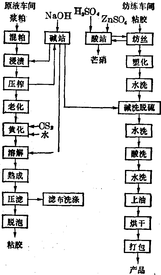 释义 | 粘胶纤维废水处理 粘胶纤维废水处理粘胶纤维是人造纤维的主要品种,以木材、棉绒、植物蒿秆等的纤维素为原料。粘胶纤维厂由制备粘胶的原液车间、后处理的纺练车间、碱站和酸站四部分组成,其工艺流程见右图。