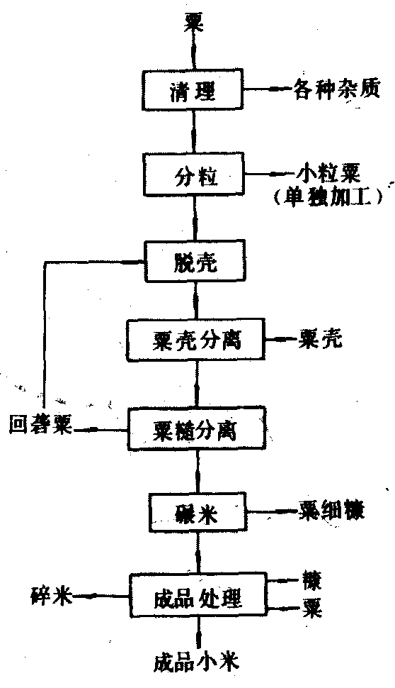 释义 | 粟加工millet processing粟经清理、脱壳、粟糙分离和碾米等工序制成成品小米的生产过程。粟在中国北方通称谷子,去壳碾米后成为小米。历来公认粟起源于中国或东南亚。代表中国新石器早期文化的河北磁山遗址(公元前5400年)、河南新郑裴李岗遗址(公元前5935)分别有谷子的种子和米粒出土,同时出土的还有石磨盘、石磨棒等工具,说明当时已有简单的粟加工。小米中含有丰富的营养成分,其中蛋白质、脂肪等含量要比大米高,而且容易被人体消化吸收。小米除了供人们作主食外,还可用以酿酒、酿醋、制糖以及制作各种风味糕点。粟加工的副产品可以作为食品和饲料工业的原料。 粟的加工工艺流程 清理 应尽量除去杂物,作到净粟入砻。常用的清理设备有吸风分离器、振动筛、比重去石机和磁选机等。 分粒 粟的粒度不整齐,会影响加工工艺效果。对于原粮粟品种混杂,粒度相差较大,最好进行分粒加工。分粒设备有振动筛、平面回转筛。分粒筛面的筛孔,可配备14目/英寸左右的方孔,其筛上物为大粒,筛下物为小粒。大粒粟提取率为90%~95%,可采用调整筛孔大小的方法进行控制。为了保证分粒效果,应注意筛面上物料流量均匀,流层厚度以不超过10毫米为宜,加强筛面清理,防止筛孔堵塞。分出的大小粟粒分别送入净粟仓分开加工。 脱壳 采用多道连续脱壳,中间辅以除壳,直到粟壳基本脱净为止。常用的脱壳设备有胶辊砻谷机、离心砻谷机和胶砖脱壳机等。 粟壳分离 粟经砻谷机一次脱壳后,可以得到粟、粟糙米、粟壳、碎米和糠皮等混合物。通常是先将粟壳除去,然后继续脱壳或进行粟糙分离。可采用风选法分离粟壳,同时还可除去糠皮,其设备有吸式风选器和吹式风选器。 粟糙分离 分离粟壳后的粟糙混合物,最好进行粟糙分离,将分出的粟送回砻谷机内继续脱壳,粟糙米则可送往碾米机进行碾米。如果不经粟糙分离而继续脱谷,会使已脱壳的粟糙米经多次脱壳机处理,而增加碎米。粟糙分离设备有选糙溜筛、选糙平转筛和巴基选糙机等。 碾米 常用的碾米设备有:摩擦擦离作用较强的铁辊压砣碾米机、碾削作用较强的三节砂辊碾米机和立式砂臼碾米机等,一般采用2~3道碾米机碾白,前道用铁辊压砣碾米机,后道用三节砂辊碾米机或立式砂臼碾米机。在每道碾米之后,辅以风选或筛选设备,清除米糠,从而提高碾白效果。 成品整理 碾制后的小米中混有米糠和碎米,有时还有少量粟粒。通常是采用吸风分离器或筛理风选设备清除米糠。筛面筛孔选用φ0.7~0.9毫米圆形冲孔筛面,或22~24目/英寸方孔金属丝筛布。然后用选糙溜筛、选糙平转筛或振动筛分离粟粒。最后用成品分级筛除去碎米,即为成品小米。筛孔大小根据小米粒度和碎米提取量决定。在成品打包前,进行磁选,除去磁性金属杂质。如采用分粒加工,需将大小粒小米混合后打包。 副产品利用 粟壳中含有大量纤维、戊聚糖和灰分,可作为燃料;经粉碎、水解后,作为饲料。粟细糠含有丰富的脂肪和蛋白质,除作饲料外,还可榨油或制蛋白制品。 粟加工millet processing粟(又称谷子)经过清理、脱壳、粟糙分离、碾米等工序制成小米的生产过程。中国粟加工历史悠久。在新石器时代的河北武安磁山遗址、郑州裴李岗遗址、西安半坡村仰韶文化遗址等发掘出距今5 000年的粟谷以及石臼等粟加工工具。长期以来粟加工处于手工生产,随着粮食加工机械的发展,粟加工技术也实现了机械化。粟的最外层有两片很大的护颖。在护颖里面有内外颖,将种仁全部裹合。内外颖较护颖坚实且厚。脱壳后的种仁为糙小米。糙小米由皮层、胚乳和胚3部分组成。糙小米经碾米后称为小米,碾下的皮层和胚称米糠。小米除食用外,还可用来酿酒、制糖,以及制作多种风味糕点。米糠含有丰富的脂肪和蛋白质,除作饲料外,还可榨油,制取蛋白制品。 |