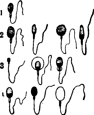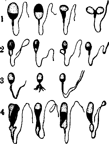 畸型精子包括头、体、尾的形态变异,或头体混合畸形。头部畸型有巨大头、头部核和胞浆倒转、蘑姑样头、双头;体部畸形有体大而粗,楔形、三角形等;尾部畸形有粗尾、粗短而分叉尾及双尾; 头体混合畸形有头体增大、核畸形变长及头体混合变长等。精子畸形率的增高,能间接反映睾丸生精功能的障碍,也必然影响了精子的活力和受精能力。