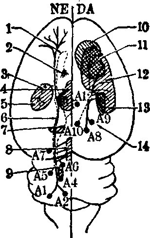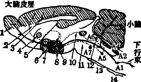 A1~A,示NE能神经元胞体的分布,A6蓝斑为最集中的胞体团。 2. 多巴胺能神经元:胞体位于中脑,发出的纤维有三条通路: ❶黑质-纹状体系统,胞体位于黑质,发出很长的纤维止于纹状体,此束对动物的活动起很大的作用。损毁两侧黑质纹状体束引起不食不饮,运动减少,对周围事物无反应等表现。 ❷中脑边缘系统,胞体位于中脑脚间核背侧,轴索上行至伏隔核和嗅结节,推测可能与某些情绪活动有关。 ❸结节漏斗系统,胞体位于弓形核,发出短轴索下行,终止于正中隆起,此部分神经元与神经内分泌功能有关。