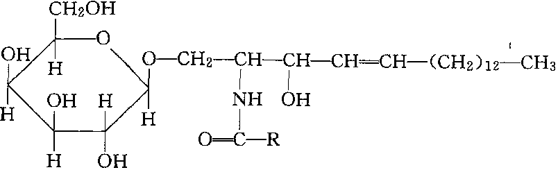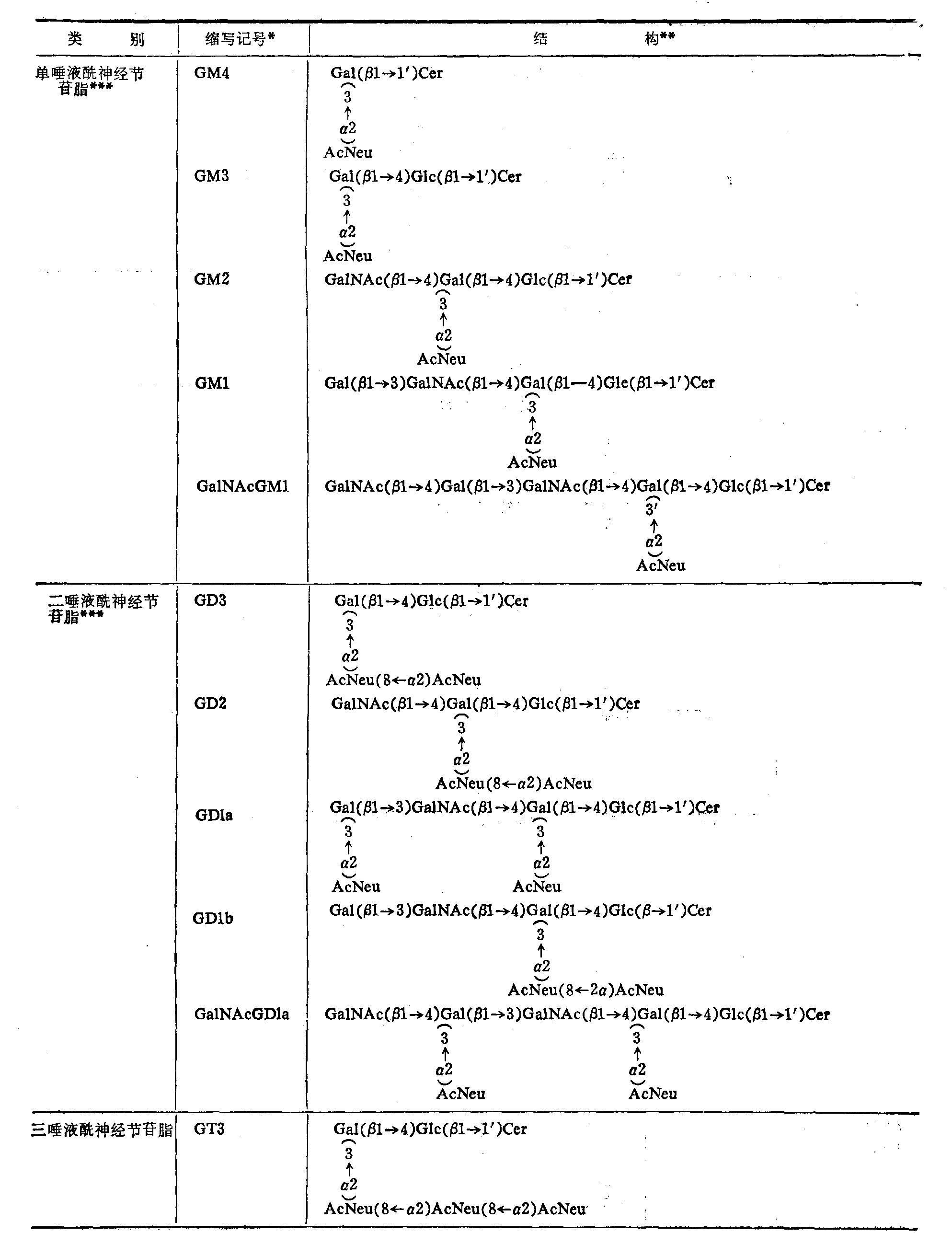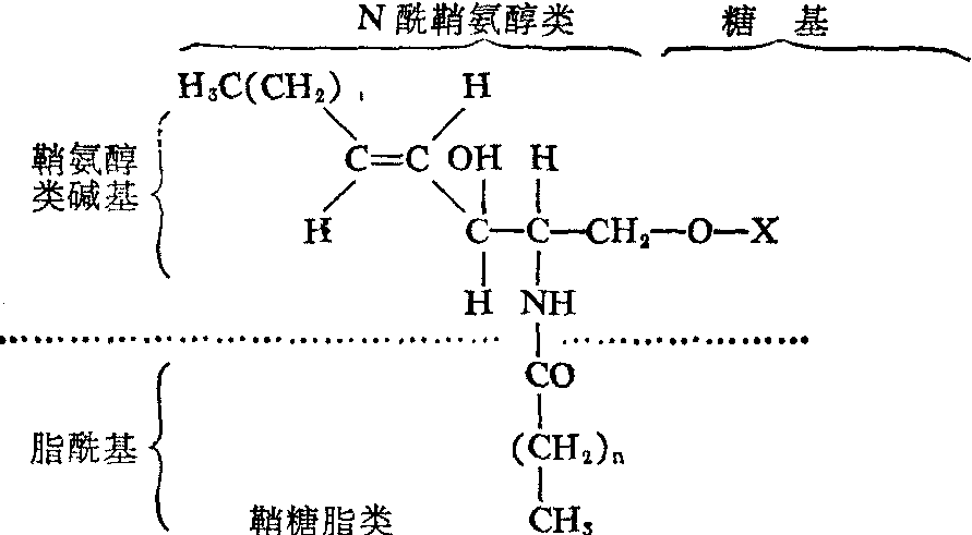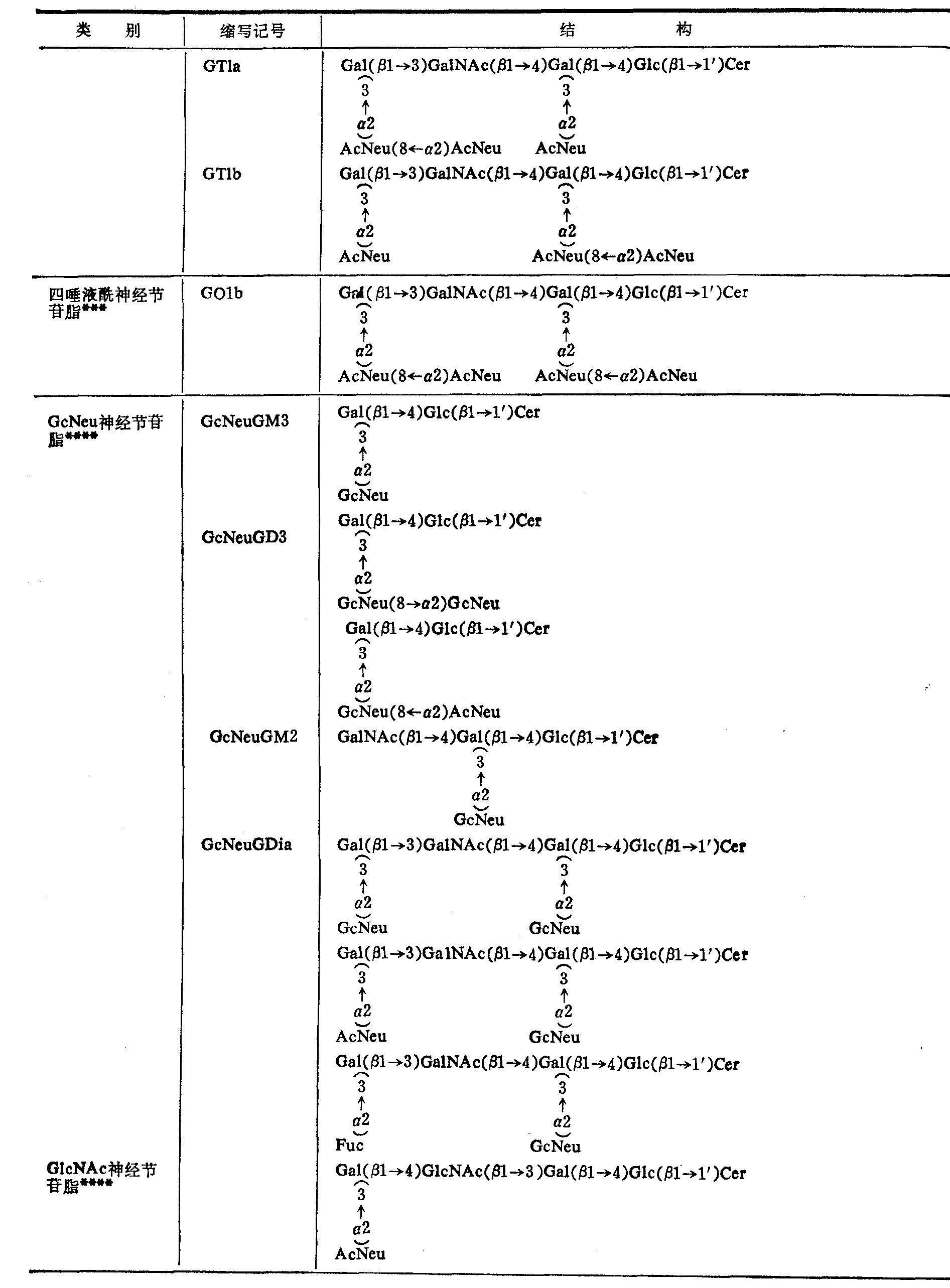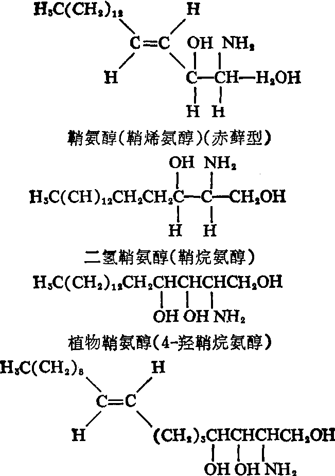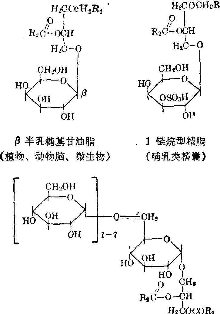 释义 | 糖脂glycolipid含糖的类脂。由一个或几个半乳糖或其他糖通过糖苷键与二酰甘油或酰化的鞘氨醇连接而成的复合脂。根据醇的不同,分为两类: 单半乳糖甘油二酯 脑苷脂 脑苷脂、神经节苷脂。两类中的代表化合物的结构如上。分子中的脂肪酸和鞘氨醇链是疏水尾,糖基为亲水头,与磷脂结构类似,参与生物膜的组成。在植物的叶绿体及动物的脑组织和神经节细胞膜系统中含量较多。糖脂glycolipide糖脂质总称为糖脂。含有半乳糖或葡萄糖、长链脂肪酸、神经氨基醇等,但不含磷酸。糖质是神经髓鞘的主要成分,亦是组成其他组织的膜结构和血型物质等。 糖脂含有糖分子的脂类物质。可由甘油衍生,也可由神经鞘氨醇衍生出来,常归于甘油酯(如糖基二酰基甘油酯)和神经鞘氨醇糖脂类(如脑苷脂)。是细胞膜结构组分,也是一些生物大分子(如脂蛋白和脂多糖)的组成成分。 糖脂glycolipid指含有糖的脂类。 糖脂 糖脂含糖而不含磷的脂类统称糖脂类。糖脂类又可以按其分子组成再分为甘油糖脂和鞘糖脂两类。含硫的糖脂习惯上称为硫脂,如精脂及硫酸脑苷脂等。 α聚葡萄糖基甘油脂(人唾液,人胃液) 鞘糖脂 鞘糖脂类的化学 鞘糖脂种类极多, 且结构复杂, 但其基本结构都是以N-酰鞘氨醇(又称神经酰胺)或具有与N-酰鞘氨醇结构相近似的长链碱基为基础,再通过其1位羟基与糖基所构成的β-糖苷衍生物,它们的化学通式可写为: 从上列通式不难看出,鞘氨醇类碱基及酯酰基具有疏水性,而糖基呈亲水性,因此在整个鞘糖脂分子内部形成疏水和亲水两个部分。这与鞘糖脂类的细胞分布和生物学作用有密切关系。 (1) 鞘氨醇类及N-酰鞘氨醇类:存在于自然界中的鞘氨醇类,其碳链长度固有不同,但是绝大多数由十八碳组成,分子中除含氨基、伯醇基各一个外,最少还必须有一个仲醇基。 由于长链上的第2、 第3位碳原子不对称,理应存在四种空间异构物,可是目前在动物组织中所发现的全属D—(+)—赤藓型。又在4、5位碳间常具有双键,而天然存在的一般总是反型的。分布于动物体的鞘氨醇类主要是鞘氨醇,植物的主要是二氢鞘氨醇、植物鞘氨醇以及8-脱氢-4-羟二氢鞘氨醇等。但是近年在动物肾脏也发现有少量植物鞘氨醇存在。几种常见鞘氨醇类的化学结构如下: 8-脱氢植物鞘氨醇(8-脱氢-4-羟鞘烷氨醇) 鞘氨醇类借其氨基与脂酰基相结合的酰胺化合物称N-酰鞘氨醇(神经酰胺)类。鞘糖脂类和鞘酯类化合物全可以看做是N-酰鞘氨醇类的衍生物。 存在于动物组织的N-酰鞘氨类分子中的脂酰基通常是由十六及十八碳组成,而最常见的又是硬脂酰基。但是人类脑中鞘糖脂常含有较多的廿四碳酰基,故曾以其所含廿四碳酰基来命名鞘糖脂(表1)。然而随着分子中糖基数的增加,糖脂的亲水性逐渐增大,在一些含寡糖基的糖脂中,即使酰基有一定差别,也不会影响整个分子的性质。 表1 脑中鞘糖脂的名称及其酰基组成 表2 部分糖基N酰鞘氨醇和硫脂的名称及结构