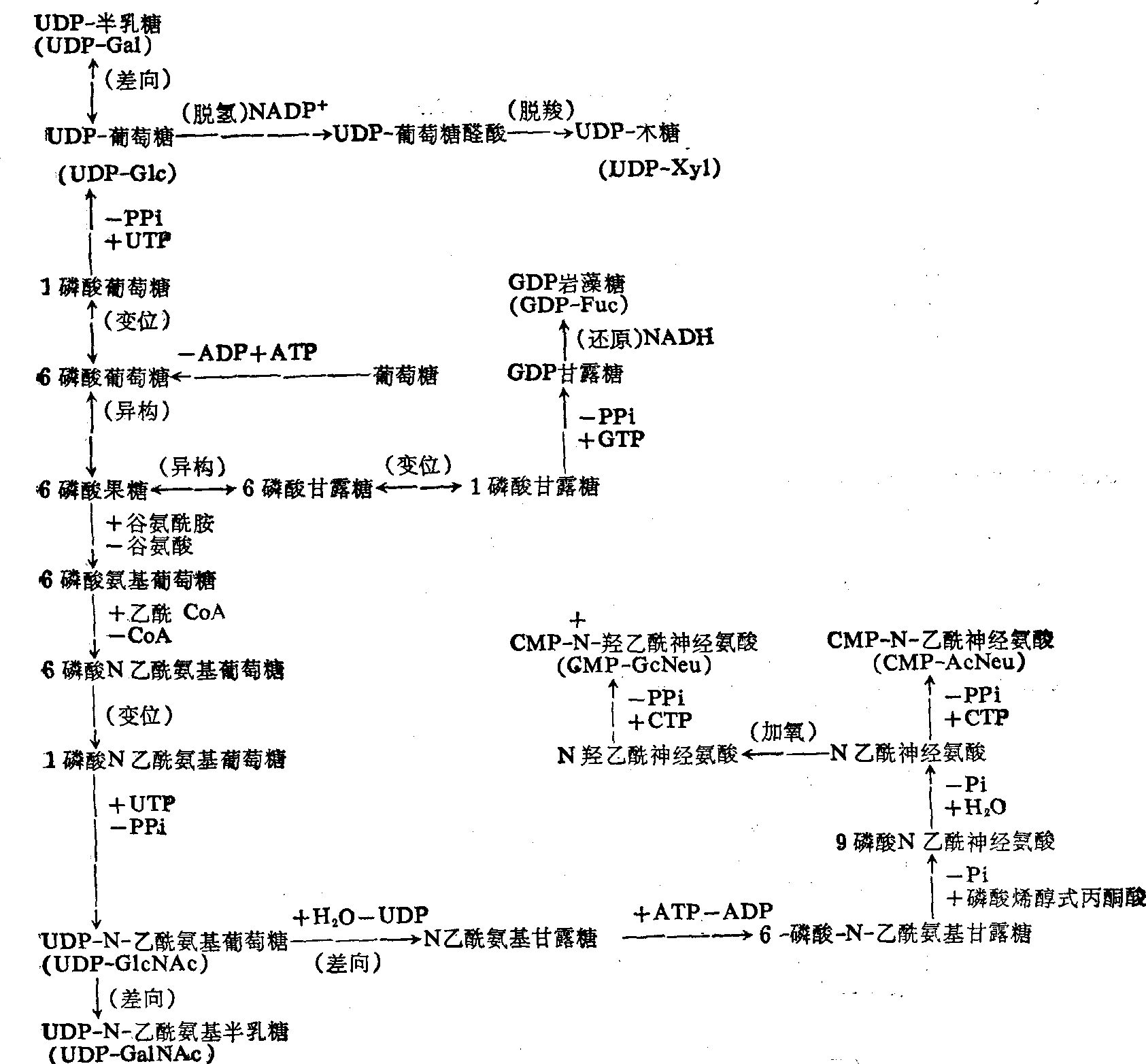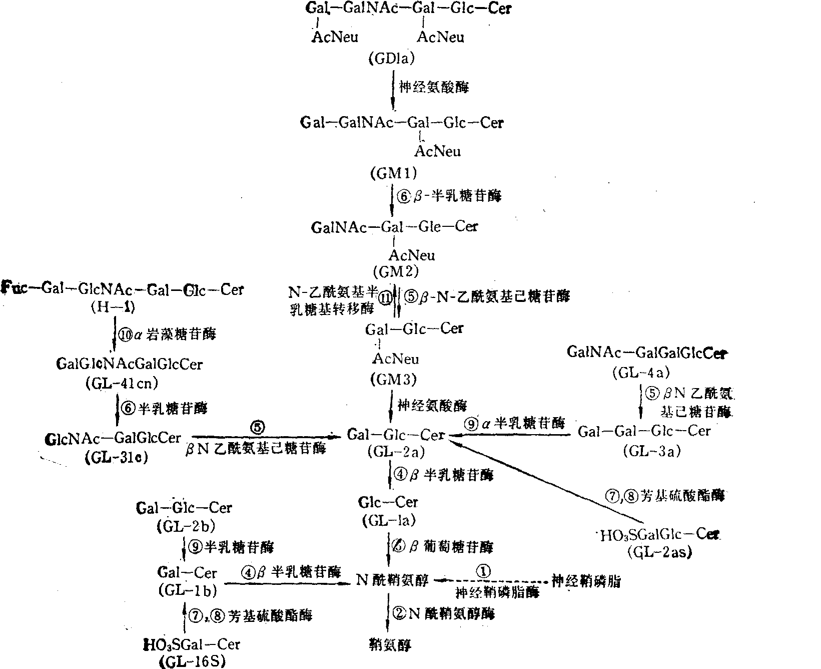 * Cer: N酰鞘氨醇基; Glc:葡萄糖基;Gal:半乳糖基; GlcNAc: N酰氨基葡萄糖基; GalNAc:N-酰氨基半乳糖基; α或β糖苷的空间配位; 1′,1,2,3,4: 结合位置。例如HO3S3Gal(β1→4)Glc (β1→1′)Cer表示 ![]() (2) 糖: 鞘糖脂分子中的糖基可以是单糖、双糖、叁糖,直至寡糖,而且组成这些糖基的单位主要是己糖和N-乙酰氨基己糖。海鸟类的木糖脂虽含有木糖,但在其他动物尚无发现。酸性糖脂的神经节苷脂分子中还含有酸性较强的N-乙酰神经氨酸(又称唾液酸)或N-羟乙酰神经氨酸,前者存在于一切动物,后者仅发现于人和鸡以外的动物。单糖的结构见“糖类”条。 (3) 鞘糖脂类的糖链结构与分类: 随着新的鞘糖脂的不断发现,给鞘糖脂类的命名和分类带来很多困难。目前比较普遍应用的一种分类是先按分子组成,将鞘糖脂分为三组: ❶只含己糖基及N-乙酰氨基己糖基的鞘糖脂称为中性鞘糖脂; ❷含N-乙酰神经氨酸基或N-羟乙酰神经氨酸基的鞘糖脂称酸性鞘糖脂或神经节苷脂; ❸带硫酸基的称硫脂。中性鞘糖脂还可根据糖基中单位糖基数的多少,再分成单糖基N-酰鞘氨醇(GL-1),二糖基N-酰鞘氨醇(GL-2),三糖基鞘氨醇(GL-3),四糖基N-酰鞘氨醇(GL-4)等。神经节苷脂按糖基中N-乙酰神经氨酸或N-羟乙酰神经氨酸基的数目又可以分为GM、GD、GT、GQ等, 并且每种还可以根据其薄层层析的Rf值的不同再分为几个亚属、如GM1、GM2、GM3、GM4…,(GM1的Rf值最小; Rf值的大小与糖基的长度成反比关系)。现将部分鞘糖类按上述分类原则列表如下(表2,3,4): 鞘糖脂类的合成代谢 参与鞘糖脂合成的酶类主要是膜结合性的,不易分离纯化,因此仍有许多不够清楚的地方。一般认为合成鞘糖脂的直接原料是N-酰鞘氨醇类(作为糖基受体)和糖基单核苷酸(作为糖基供体)。N-酰鞘氨醇类的合成酶系统主要存在于微粒体,而糖基的转移反应则主要依靠高尔基复合体中的多种糖基转移酶类的催化。 表3 部分血型糖脂*的结构 *组成上均含GlcNAc,且具特殊生物学活性,故另列表 **Fuc:岩藻糖基,其它与上表相同 表4 部分神经节苷脂的结构 (续表) (续表) *按Svennexhalm **AcNeu: N乙酰神经氨酸基(即唾液酰基)GcNeu: N羟乙酰神经氨酸基;其他与上表相同 ***这类神经节苷脂主要存在于动物脑组织。 ****这类神经节苷脂主要分布于神经组织以外的各种组织,但在人体尚未发现GcNeu神经节脂苷类。 图1 各种糖基单核苷酸的生成途径 (1) 糖基单核苷酸类的合成: 参与糖脂合成的各种糖,首先需要激活成为单核苷酸衍生物,其转变途径大致如图1。 (2) N-酰鞘氨醇类的合成,长链脂酰辅酶A和丝氨酸缩合及脱羧成了酮二氢鞘氨醇,还原为二氢鞘氨醇,再脱氢生成鞘氨醇类,再进行酰化即可形成N-酰鞘氨醇类。离体实验认为,机体内进行的酰化反应有两种,而在生理情况下以微粒体酶系途径为主。 (3) 鞘糖脂的合成. 机体内单糖基鞘糖脂的合成可有两种方式,一是N-酰鞘氨醇的糖化,由糖基转移酶类催化进行,糖基直接来自糖基单核苷酸,即鞘氨醇先N-酰化后糖基化; 二是糖基鞘氨醇的酰化,即鞘氨醇先被糖基单核苷酸糖化,然后被脂肪酰CoA酰化。动物组织内可能以前者为主。 单糖基糖脂又可以在多种糖基转移酶(半乳糖基转移酶、葡萄糖基转移酶、岩藻糖基转移酶、N乙酰氨基葡萄糖基转移酶、N乙酰氨基半乳糖转移酶以及N-乙酰神经氨基转移酶等) 的作用下进一步糖化,逐渐加长糖链,合成不同的糖脂。硫脂类是在硫酸转移酶作用下进行硫酸酯化的,3’磷酸腺苷-5’-磷酰硫酸是硫酸基供体。 鞘糖脂的分解 组织中的鞘糖脂在多种水解酶的共同作用下可以逐步分解。这些酶主要有: 芳基硫酸酯酶(有A、B、C三种)、β-葡萄糖苷酶 (有膜结合性和可溶性两种)、β-半乳糖苷酶(有Ⅰ、Ⅱ两种)、α-半乳糖苷酶(有A、B两种)、α-岩藻糖苷酶、β-N-乙酰氨基己糖苷酶(有A、B、C三种)、N-乙酰神经氨酸酶(唾液酸酶)以及N-酰基鞘氨醇酶等。这些酶主要分布于溶酶体中,但血清等体液中也含少量。高等动物体内的各种糖苷酶通常全属外切糖苷酶,只能作用于糖脂中糖链的非还原末端苷键,对组成糖苷键的糖的种类和α,β构型具有特异性。 糖脂的生物学功能 糖脂只是由糖与脂两类物质组成,故具有与磷脂相似的兼溶性特性,是构成某些生物膜的原料。此外,糖脂所含的糖不只一种,链长不一,其中单糖的排列顺序亦有别,而且其间的连接键的位置也不尽相同,足见糖链的种类各式各样,因此其生物学性质和功能就各具特点。 图2 鞘糖脂类的分解途径及有关酶类(数字表示表5所列代谢障碍病) 糖脂,尤其是糖鞘脂,虽然也是生物膜的一种组成成分,但与磷脂在分布上不同,只存在于双分子层的外层。迄今所有研究都表明,哺乳动物细胞的质膜都含有糖鞘脂,而且全部都在膜的外侧,其糖链均暴露于细胞表面。糖是高度亲水的,除非消耗很多能量,要将糖脂中糖的部分置于双分子层疏水烃链核心中是不可能的。这样看来,糖在糖脂分子中起着定向的作用,使糖脂不能从膜的外侧挪到内侧,以维持生物膜两面的不对称性。 含糖脂最多的膜可能要算髓鞘质,超过其干重的20%(见“磷脂”条图5)。髓鞘质实际只是神经鞘细胞的质膜。神经鞘细胞确实将其胞质及核挤到一边,以其质膜多层裹绕末梢神经轴索及树突,感觉神经节细胞,以及中枢神经白质等,使其绝缘,以利神经传导。如此看来,糖脂在构成神经元的绝缘物质上占有一