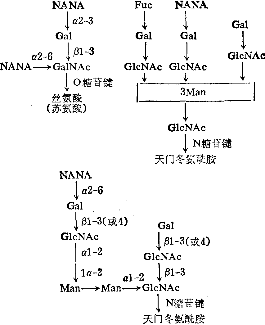 释义 | 糖蛋白glycoprotein由蛋白质和糖或糖的衍生物所组成的一类复杂蛋白。分子中糖的含量变化很大,少的仅含0.3%,多至80%以上。糖的组分主要有D型的半乳糖、甘露糖、葡萄糖、木糖和L型的岩藻糖、阿拉伯糖以及己糖的一些衍生物和唾液酸等。具有分枝的寡糖链以共价键与蛋白质相连,主要以糖基的1位碳与肽链中羟基氨基酸的羟基或天冬酰胺的酰胺基形成的O-型或N-型糖苷键相连。广泛存在于动物、植物、微生物的细胞及其体液中,如一些激素及其受体,外源凝集素(或称选择素),一些糖苷酶和膜蛋白等。不仅是细胞的一种结构组分,具有支持、保护、润滑机体的功能,而且与酶催化、细胞和分子间识别,以及生物体的抗冻等作用密切相关。 糖蛋白glucoprotein系与糖结合的蛋白质。糖蛋白中的糖多为己糖、氨基己糖、甲基戊糖及唾液酸等。糖蛋白可由肝脏、内分泌细胞及浆细胞等组织合成,存在于血浆、细胞膜及神经组织中。血浆中的糖蛋白种类及功能较多,包括起运输作用的运铁蛋白、运血红素蛋白及结合珠蛋白,调节机体不同生理活动的激素,参与机体免疫反应的免疫球蛋白,参与血液凝固的凝血因子。生物膜中的糖蛋白与细胞间识别及信息传递以及膜上受体的功能有关,神经组织中的糖蛋白则与神经系统功能有关。 糖蛋白一类结合蛋白质。非蛋白质部分为糖类物质,并以共价键与蛋白质部分相连接,同时糖类部分往往含有氨基已糖。广布于生物界,如动物体的细胞膜、血液、皮肤、软骨和其他结缔组织中,植物的细胞壁、一些酶分子以及种子植物的贮藏蛋白中都有存在。 糖蛋白glycoprotein是一种结合蛋白质。其中非蛋白质部分为糖类物质。并以共价键与蛋白质部分相连接,其糖部分常含有氨基乙糖。 糖蛋白 糖蛋白糖蛋白是一大类含糖的结合蛋白质。它们虽然是蛋白质,但其所含的糖在生物学活性上较为突出,故许多糖蛋白的研究,多以糖为主。此处只讨论糖蛋白的糖链部分,而其多肽链部分则参见“蛋白质”条。糖蛋白所含的糖主要是一些由多种单糖构成的杂寡糖链或杂多糖链。这些杂糖链借N或O糖苷键连接于多肽链部分上。一种糖蛋白分子中的糖链往往不是一条,而是多条,而且在结构上有时也有差异。这表明糖蛋白的结构相当复杂。 组成这类糖蛋白糖链的单糖,除N乙酰氨基葡萄糖外,还有甘露糖、半乳糖、唾液酸及岩藻糖等,但他们并非在这类糖蛋白的所有糖链中都有存在。人的运铁蛋白的糖链的结构已清楚,它不含岩藻糖。 ![]() 人运铁蛋白分子结构 从运铁蛋白的糖链结构,可以看出末端为一唾液酸。许多种血浆型糖蛋白的糖链末端基本上均为唾液酸;运载糖蛋白的末端唾液酸是与其运载功能有关; 在去掉唾液酸后,即失去其运载作用。在血浆中,有运载功能的糖蛋白,除运铁蛋白外,还有运载维生素B12通过回肠壁的内因子,皮质素传递蛋白,与组胺结合的血浆凝合素、运输铜的血浆铜蓝蛋白、以及运载钙离子、孕酮、甲状腺素等的糖蛋白。 卵泡刺激素(FSH)、黄体生成激素(LH)、人绒毛膜促性腺激素(HCG)、促甲状腺激素(TSH)、促红细胞生成素等都属于糖蛋白类激素。前四者都是α与β二条多肽链组成; 其α链完全相同,只有β链各异,这表明β链是赋与不同激素性质的所在。这些糖蛋白激素的糖链末端多为唾液酸。去除激素的糖链即可消除其激素性质,甚至只去除其唾液,也可消除其激素性质。 凝血酶原是一种糖蛋白; 在其转变为凝血酶的过程中,糖链并未丧失。牛凝血酶已证明含有不少于7%的糖,其中有唾液酸、中性单糖、氨基葡萄糖及氨基半乳糖等。血浆中也存在酶的抑制剂,人血浆中的α1抗糜蛋白酶及α1抗胰蛋白酶都是含有唾液酸的糖蛋白,分别抑制糜蛋白酶及胰蛋白酶的活性,但在丧失其唾液酸后,即失去其抑制活性。 免疫球蛋白是血浆型糖蛋白中另一类生物学活性物质,一般称为抗体。抗体是与其特异抗原相结合而起作用的,用以与抗原结合之点是其氨基末端。糖链似与抗体的生物学活性无关,但对抗体受蛋白水解酶的作用方面似可起保护作用,另外在抗体的分泌上亦不无帮助。 血浆中还有一些生物学活性蛋白质,也是糖蛋白,如纤维蛋白原、抗血友病球蛋白、纤维蛋白溶解酶原、纤维蛋白溶解酶及α1酸性糖蛋白。α1酸性糖蛋白在人体有创伤、炎症、类风湿性关节炎或肿瘤时,它在血中的含量即增加。它在体内的功能,尚不清楚,但已发现,它在肿瘤细胞周围形成一凝胶层。糖含量很高,约为42%,其糖链末端多为一含有自由羧基的唾液酸。在体液的pH条件下,糖链末端的唾液酸可游离成为带阴电荷的离子;这就使肿瘤细胞具有排斥带阴电荷的抗体及致敏了的淋巴细胞。这样看来,α1酸性糖蛋白具有保护肿瘤细胞的作用。 颌下粘蛋白型糖蛋白 颌下粘蛋白型糖蛋白的一个共同点是通过一个O糖苷键与多肽链部分相连。这个O糖苷键是由糖链还原性末端N乙酰氨基半乳糖的异头羟基与多肽链中丝氨酸或苏氨酸残基的脱水缩合而成。 若干种哺乳类动物颌下粘蛋白的糖含量相当高,约占其重量的60%。牛、羊颌下粘蛋白的糖链仅由唾液酸及N乙酰氨基半乳糖组成; 而人及猪的,除含这两种单糖之外,还有岩藻糖及半乳糖。一般,颌下粘蛋白含糖虽高,但其糖链并不太长,仅数目较多而已。例如,羊颌下粘蛋白只含有分子量为58 000的一条多肽链,其氨基酸残基