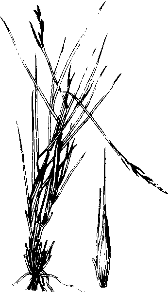 糙隐子草scabrous cleistogenesCleistogenes squar-rosa(Trin. )Keng,又称兔子毛。禾本科,隐子草属。多年生密丛小型草本。优质牧草。广泛分布于欧亚草原区。中国分布于内蒙古、华北、西北各地;蒙古、俄罗斯、哈萨克斯坦以及欧洲一些国家也有分布。多生长于栗钙土。作为下层的伴生种或亚优势种,与针茅、羊草等组成草原群落;过度放牧时可形成建群种。茎密多节,高10~40 cm。叶片较薄,内卷,粗糙,叶鞘无毛,内有隐藏小穗。圆锥花序狭窄,小穗含2~3朵花。霜后植株变褐、褐红色,具独特群落季相。草质柔软,适口性好,牛、羊、马、骆驼均喜食。营养价值较高,为秋季放牧抓膘草之一。