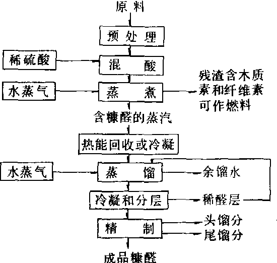 释义 | 糠醛furfural植物纤维原料中的戊聚糖经水解和脱水生成的产物。又称2-呋喃甲醛。分子式为:C4H3OCHO,结构式为: 简史和现况 1832年德别雷纳(J.W.Doberei-ner)报道了在蔗糖加二氧化锰和硫酸作用制备甲酸时,从混浊的馏出液中分离出黄色的油状物质。由于数量太少,未能鉴定和命名。1840年斯滕豪斯(J.Stenhouse)用玉米芯、燕麦壳取得同样的产物,并进行了化学组成的研究,确定了分子式,从而推断出用任何植物原料都可以获得糠醛及其有关产物。但其名称是由1845年福恩斯(G.Fownes)先命名为糠油,后发现其具有醛的性质,而改成糠醛。直到1922年美国桂格燕麦公司(The Quaker Oats Co.)首先宣布糠醛的工业化生产。1988年美国年产量约6万吨,占世界第一位。主要生产国还有多米尼加、中国、苏联、法国、南非联邦等国家,世界年产量约30万吨。中国自1943年起生产糠醛,至1989年产量超过4万吨,是世界主要出口国家之一。 生产工艺 糠醛是用富含戊聚糖的植物原料生产的。常用的有玉米芯、燕麦壳、棉籽壳、甘蔗渣、稻壳等,以玉米芯为最好。它们的平均理论糠醛含量(%)为:玉米芯23.4,燕麦壳22.3,棉籽壳18.6,甘蔗渣17.4,稻壳11.4。戊聚糖转变成糠醛的反应过程分两步进行:若上述两个反应是在同一设备中同时进行的,称直接法(或一步法);依次分别在两个设备中进行的,称为间接法(或两步法)。常用的直接法,具有设备简单、得率高、成本低、生产能力大等优点,但原料中各组分的综合利用差些,因此间接法仍在研究改进中。 反应过程中糠醛会进一步分解成甲酸和腐殖质。糠醛得率的高低取决于糠醛的生成和糠醛的分解两个反应。影响糠醛得率的因素除了原料特征以外,还有催化剂的种类和浓度、固液比、温度、蒸汽用量及蒸汽在料层中的流动状态等。各国根据原料的特征、催化剂的种类等条件,采用不同的反应设备、水解工艺和加工方法。如美国桂格燕麦公司法(包括间歇和连续两种)、法国农业呋喃法等。中国采用立式间歇式水解锅稀硫酸水解工艺。 直接法糠醛生产示意流程为: 原料和稀硫酸混合后,直接装入水解锅中蒸煮,反应温度在170℃左右。通常用过热到220℃的水蒸气加热,使原料中的戊聚糖水解成戊糖,并进一步脱水生成糠醛。在水蒸气加热和流动下,将生成的糠醛带出水解锅。接着通过二次蒸汽发生器回收热能,醛汽冷凝成原液。生成的二次蒸汽压力较低,可作为蒸馏、精制等的热源。原液中的糠醛浓度受水解工艺和操作条件而变,一般为3~6%。 原液经初馏塔加工,塔顶收集20~30%浓度(受其中低沸点物杂质含量影响而变化)糠醛汽,经冷凝、冷却分成两层:上层为稀醛层,含醛10%,含水90%;下层为浓醛层,含醛90~93%,含水7~10%。上层稀醛送回流或低沸点物塔处理,下层浓醛经脱水和精馏制成成品。 原料和工艺过程对产品质量影响较大。若粗醛中有机酸含量过高且加工达不到标准要求时,可用中和法或水洗法处理。副产物甲醇和醋酸需要时可以回收。水解蒸煮过程的残渣主要用作锅炉燃料。 理化性质 刚蒸馏所得的产品是无色透明的油状液体,与空气接触,颜色逐渐转变成黑褐色。它能与大多数普通溶剂互溶,但与饱和脂肪烃只能微量互溶。无机盐一般不溶于糠醛。 糠醛的分子量96.08,沸点(101.3千帕)161.7℃,冰点—36.5℃, 折射率(n20D)1.5261, 密度(d204)1.1598,闪点(闭口杯)61.7℃,燃点315℃。糠醛与水形成具有最低沸点的恒沸物,常压下沸点97.9 ℃,含糠醛35.2%(重量)。与水部分互溶,20℃时水层和糠醛层分别含糠醛8.3%和水95.2%(重量)。 糠醛的化学性质与呋喃环和醛基有关。在无氧的条件下糠醛是热稳定的,在高温(230℃)下经历若干小时后,除颜色转深以外,其他物理性质不发生变化。 糠醛在催化剂存在下氧化成糠酸,还原成糠醇,脱羰基成呋喃,与强碱作用发生卡尼查罗反应,生成糠醇和糠酸盐。像别的醛类一样,糠醛与具有活泼亚甲基功能团的化合物(如脂肪醛、酮、腈等)缩合,也能与糠醇和酚类化合物作用生成树脂。 糠醛在稀酸中会进一步分解,结果形成黑色的聚合物,反应速率与氢离子浓度和反应温度有关。呋喃环易受大气中氧作用,生成酸性氧化物,添加碱性物质可阻止自氧化反应。糠醛的颜色随酸和聚合物含量增多而变深。 糠醛与苯胺—冰醋酸反应呈鲜红色,常用于糠醛定性显色反应。定量分析以醛基和呋喃环两种性质为基础,常用的容量法有盐酸羟胺法和溴化法。重量法是间苯三酚法。选择测定法时,应考虑杂质的影响。中国成品分析时采用盐酸羟胺法。中国工业糠醛国家标准技术要求如右表。 用途 糠醛主要用作生产呋喃衍生物(糠醇、四氢糠醇、硝基呋喃类药物)的原料。糠醇主要用于铸造树脂生产。铸造工业采用糠醇树脂可以提高铸件质量,降低成本。糠醇树脂还用于设备防腐等方面。糠醇树脂与糠醛丙酮树脂、糠醛(或糠醇)和苯酚甲醛反应生成的树脂一起统称为呋喃树脂。呋喃树脂具有耐酸、耐碱、耐较高温的性质,用于砂轮胶结剂,防腐涂料等。糠醛是良好的选择性溶剂,分离饱和脂肪族化合物中的不饱和化合物和色素等,用作润滑油和植物油等精制和松香脱色,树脂稀释、阻聚,以及四个碳的馏分中分离丁二烯等萃取蒸馏的溶剂。 中国工业糠醛国家标准