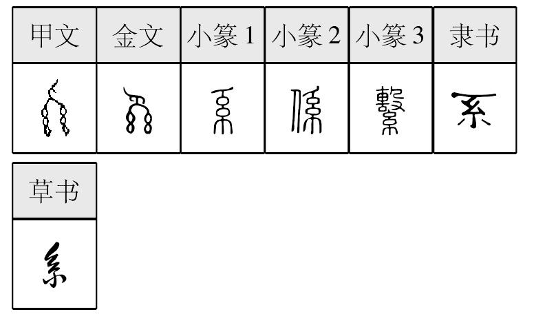 系,表意,甲骨文、金文象手持成束的丝形,小篆字形有简省。读xì,本义为联属、接续,引申为继承、继续、系统(同类事物按一定关系组成的整体)、拴东西的带子、按学科划分的高等院校的教学行政单位等。係,形声,从人,系声,读xì,本义为捆绑,引申为拴东西的带子、连结、继续、表示判断(相当于“是”)等。繫,形声,从糸, (jī)声,本义读xì,粗劣的(丝絮等),引申为拴绑、拘禁、结合或联系、挂念、拴东西的带子、把捆好的人或东西向上或向下送等;又读jì,引申为打结、扣住。这三个字有时通用。近代俗字、《手头字》、《简化字表》采用同音通用字,把“繫”简作“系”;《简化字表》又把“係”简作“系”。 【辨析】 “系”与“係”“繫”不是等义简繁字。 【构词】 系列(系列)∣系统(系統)∣菜系(菜系)∣嫡系(嫡系)∣父系(父系)∣母系(母系)∣派系(派系)∣山系(山系)∣世系(世系)∣水系(山系)∣太阳系(太陽系)∣体系(體系)∣星系(星系)∣语系(語系)∣院系(院系)∣支系(支系)∣直系(直系)∣中文系(中文系)∣系词(係詞)∣系数(係數)∣系指(係指)∣干系(干係)∣感慨系之(感慨係之)∣关系(關係)∣心系(心係)∣确系如此(確係如此)∣实系(實係)∣系绊(繫絆)∣系辞(繫辞)∣系挂(繫掛)∣系怀(繫懷)∣系累(繫累)∣系念(繫念)∣系起(繫起)∣系上(繫上)∣系绳(繫繩)∣系狱(繫獄)∣系扎(繫紮)∣系住(繫住)∣悬系(懸繫)∣魂牵梦系(魂牽夢繫)∣拘系(拘繫)∣联系(聯繫)∣牵系(牽繫)∣拴系(拴繫)∣维系(維繫)∣系领带(繫領帶)∣系鞋带(繫鞋帶)∣系衣扣(繫衣扣∕繫衣釦)系 (xì)繫也。从糸,丿聲。 系 ☚ 啟 奚 ☛ 系〈动〉表示判断。是。 《醒》九九: 却是镇雄、乌撒两个土官知府,原~儿女亲家,因儿女夫妇不和,各家的大人彼此护短。 《聊·寒》一: 咱爹爹行辈尊,不~他门下人,不下驴怎么就打一顿? 另见jì(“系儿”等)。 |