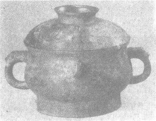 西周。盛食器。通高17厘米,口径18厘米,腹径18.4厘米,足径14.7厘米。重2.6公斤。北京市文物工作队在废旧物品中拣选。此簋覆碗形盖,盖上有一碗形钮,腹侧附长舌兽形耳一对,圈足矮耳。器盖与器腹中部各有竖环耳两个。全器光素无纹饰,通体泛出莹绿的光泽。这种造形的铜簋,在西周青铜礼器中实属罕见,是一件不可多得的珍贵文物。