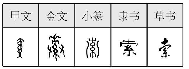 ❹ 奔车朽索|不假思索|坟典丘索|敲诈勒索 索索,甲骨文作 ,金文作 ,小篆作 。 甲骨文象繩索之形,金文增 “廾” 作意符。本義是繩索,引申爲絞搓、搜求、索取、求索、探索等義。用作名詞有法度等義,當由比喻義而來。卜辭或用作方國名。銘文或用本義,或用同“素”。提示:“素”由“索”字分化而出,當即甲骨文 二字,字形以雙手持束絲或繩索會意,蓋 “素” 初指原始織物,固由絲麻纖維絞綫編織而成,與 “索” 形音義皆一脈相承。 楚簡帛文作  ,沿襲古體,或有訛變。秦簡牘文作 ,古隸典型。 索suǒ象形会意字,下为丝,小篆上像绞绳的工具。《尔雅》说:“小者谓之绳,大者谓之索。”作声符生成的字有: suō 嗦(啰嗦) 索suǒ(10画)