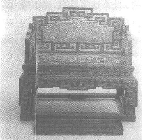 清。宽104厘米,深84.5厘米,通高103厘米。北京故宫博物院藏。三面屏风式座围子如台阶般渐次递下。束腰。足下有长条形托泥,并附脚踏。座围子三面嵌剔红桃树、灵芝图;座面饰描金花卉;束腰浮雕圈纹、链纹;腿足浮雕回纹和拐子纹。纹饰繁缛,做工精细。雕漆技术与硬木相结合的家具,是从清乾隆时开始流行的。