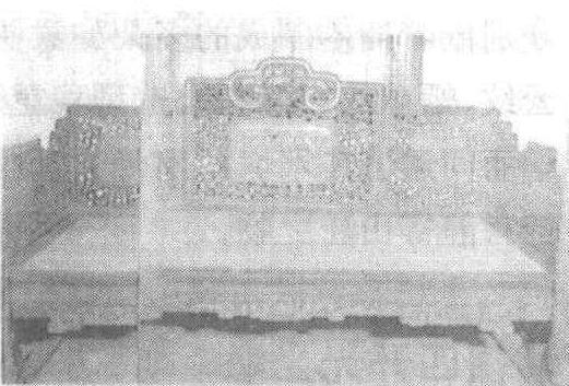 清雍正。长220厘米,宽130厘米,高58厘米,通高138厘米。河北省承德避暑山庄四知书屋藏。床围呈屏风式,共五扇,围环左、右、后三面。每扇屏风中间均有一长方形委角环板,上浮雕五蝠祝寿、吉磬祥云等寓意纹样,旁边衬以浮雕、透雕的蟠虺纹。床围后边的屏风正中挑起一朵卷云,上饰透雕的云气纹。左、右两屏风边缘高低起伏不平。床有束腰,外翻马蹄状足。牙条下边缘凸凹多变,上面阳刻螭纹和拐子纹。此床华美高贵,是清式家具的精品。