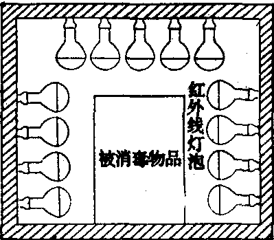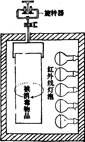 红外线杀菌作用的强弱,依其产生温度的高低而定。灭菌所需温度和时间,与干烤相同 (见“热力消毒”条)。红外线热效应仅产生于所照到的表面,故仅适用于表面平坦或导热性强物品的处理,如手术器械、注射器及其他玻璃器皿等。为使物品受热均匀,可采用多面照射或旋转式单侧照射(见图)。