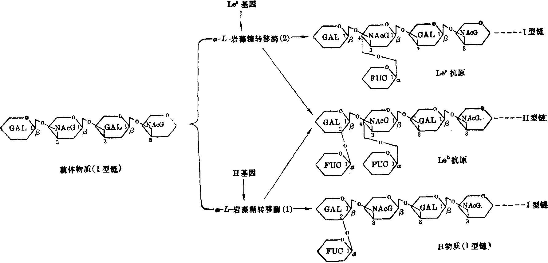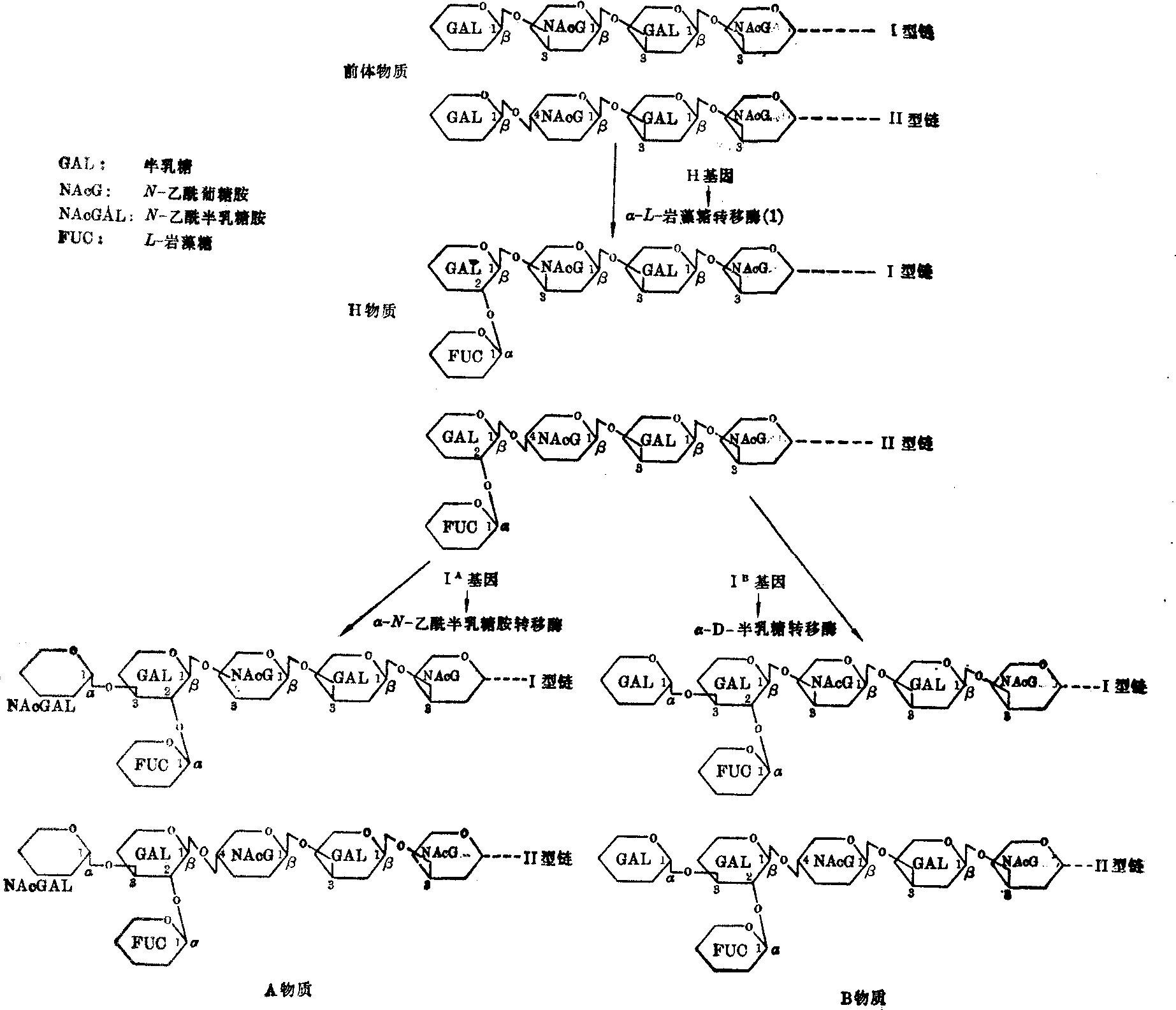 A抗原和B抗原不仅存在于红细胞表面,也存在于胃、肠、毛发、骨胳等其他组织中。有些人在唾液、胃液、胆汁、精液等分泌物中也有A抗原和/或B抗原,称为分泌型。在分泌物中没有A抗原和B抗原的人称为非分泌型。分泌型和非分泌型受控于另一对等位基因Se和se。基因型Se Se和Se se为分泌型,基因型se se为非分泌型。 A抗原和B抗原的出现需以存在H抗原为前提。i基因为无效等位基因,O型红细胞有H抗原但不能由此产生A抗原或B抗原。因此ABO血型有时称为ABH血型。1952年,Bhende在印度孟买首次发现一种特殊O型,这种红细胞既无A抗原和B抗原,也无H抗原,称为孟买型。这表明存在一对等位基因H和h。基因型HH和Hh能产生H抗原,由此再经IA和IB基因的作用而出现A抗原和B抗原。基因型hh不能产生H物质,即使有IA和IB基因也无从形成A抗原和B抗原。Hh位点和ABO位点是彼此独立的,因此孟买型可按有无IA和IB基因而记为Oh、OAh、OBh、OABh。 红细胞膜上的血型物质是脂溶性的糖脂,分泌物中的血型物质是水溶性的糖蛋白。两者糖链的主链的化学结构特点如下: ❶红细胞膜上的血型物质:D-半乳糖—N-乙酰葡糖胺—D-半乳糖—葡萄糖—鞘脂; ❷分泌物中的血型物质: D-半乳糖—N-乙酰葡糖胺—D-半乳糖—N-乙半乳糖胺。对水溶性血型物质的分析表明,糖蛋白的肽链赋予血型物质以抗原性,末端多糖赋予血型物质以特异性。A物质和B物质经过各自的特异性酶降解后,由A物质可得H物质和N-乙酰半乳糖胺,由B物质得H物质和半乳糖。两者差别仅在一个单糖残基。H物质可进一步分解为Ⅰ型和Ⅱ型前体链及岩藻糖。现知H基因的产物是α-L-岩藻糖转移酶(1),此酶催化在Ⅰ型和Ⅱ型前体链的末端半乳糖残基上接上一个岩藻糖,由此构成H物质。IA基因的产物是α-N-乙酰半乳糖胺转移酶,经此酶催化,再在H物质末端半乳糖残基上接上一个N-乙酰半乳糖胺,由此构成A抗原特异性。IB基因的产物是α-D-半乳糖转移酶,经此酶催化,再在H物质末端半乳糖残基上接上一个D-半乳糖,由此构成B抗原特异性(图1)。在孟买型中,Oh者缺乏α-L-岩藻糖转移酶(1),因而不能形成H物质,OAh、OBh、OABh虽有相应受控于IA、IB基因的酶,但因为无作用底物,所以只能成为孟买型。 图1 水溶性A物质和B物质的形成 MNSs血型系统 1927年,Landsteiner等以兔抗人红细胞血清检出红细胞抗原M和N,受控于一对等位基因M和N,计有三种基因型MM、MN和NN,决定三种表型M(+),M(+)N(+),和N(+)。1947年,Walsh等在一新生儿溶血症患儿的母血中发现抗S抗体; 1951年,Levine等找到抗S抗体,两者检出的抗原受控于另一对显性基因S和隐性基因s。MN位点和Ss位点密切连锁,组成四种基因复合体MS、Ms、NS和Ns,由此产生十种基因型和六种表型(表4)。 据上海市中心血站报道,我国人(民族不详)Ss血型的表型频率为S(+)0.0863,s(+)0.9137(表5)。 P血型系统 1927年,Landsteiner等用兔抗人红细 表4 MNSs血型系统的表型和基因型