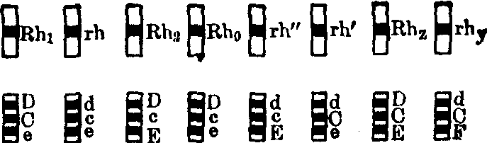 Rh血型系统 1940年,Landsteiner和Wiener发现约85%白人的红细胞可为兔抗猕猴红细胞血清所凝集。当时认为有些人的红细胞有与猕猴共有的抗原决定簇,称之为Rh因子。在这之前一年,Levine和Stetson报道了一个O型产妇娩出死胎,又在输入其O型丈夫血时发生严重输血反应,此产妇血清可使104例O型红细胞中83例发生凝集,后来证明此产妇血清的特异性与兔抗猕猴红细胞血清相同。紧接着Race等(1943,1944),Levine(1945),Mourant(1945)相继发现人体血清可检出属于Rh血型系统的另外四种特异性。因此检测Rh血型共有五种抗血清。 对Rh血型系统的遗传有下列两种学说,至今还不能肯定谁是谁非(图2)。 图2 Rh血型位点的命名 Fisher和Race认为,Rh血型系统决定于三个密切连锁的独立位点,各有一对等位基因:C和c;D和d;E和e。五种Rh血清称为抗C、抗c、抗D、抗E和抗e;至今未曾发现抗d血清,d仅表示无D抗原。D是最初发现的,也是最重要的Rh抗原。D阳性即Rh阳性,D阴性即Rh阴性。这三对连锁基因组合成8种Rh基因复合体:cDe、CDe、cDE、cde、Cde、cdE、CDE、CdE。Fisher认为,这三个位点在染色体上的位置是D-C-E。虽然Fisher假设稀有基因复合体CDE和cdE来自交换,但事实上至今未曾发现发生交换的家系。 Wiener认为,Rh血型系统决定于单一位点上的8个等位基因: Rh0、Rh1、Rh2、rh、rh′、rh″、Rhz、rhY。每个等位基因控制一种凝集原,它有若干抗原决定簇或称抗原因子,各自可为特异血清检出。 上述两种学说命名的相互关系见表8 表8 Rh血型系统Fisher-Race和Wiener命名对照