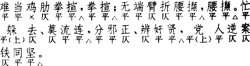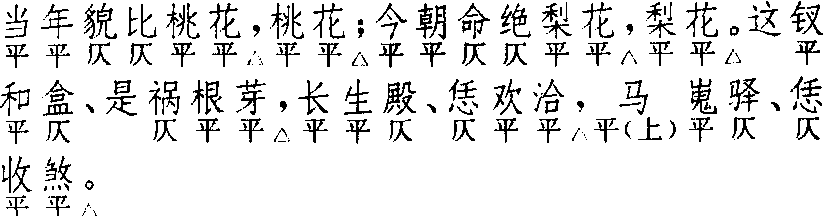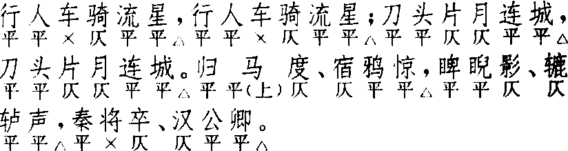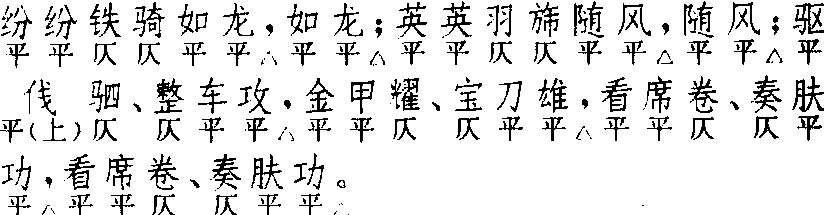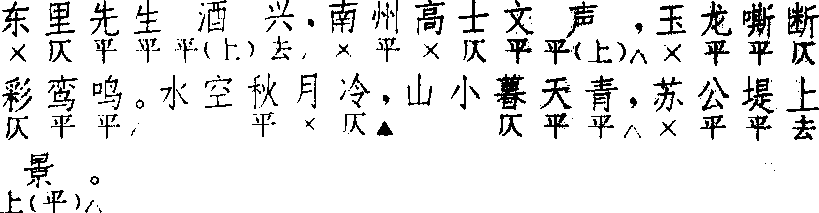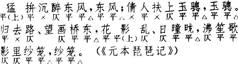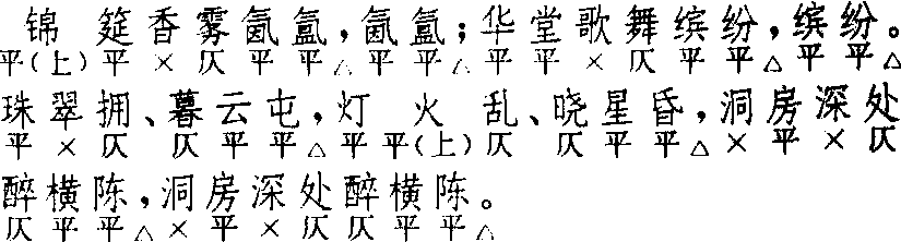 释义 | 红绣鞋 红绣鞋冯子振 小令 ![]() 全曲六句:6△,6△,7△。3▲,3△,5△。首二句及第四、五句均须对。第四、五句本三字,作者多作五字对语;且以此二句与末句作鼎足对,如张可久“老梅盘鹤膝,新柳舞蛮腰,嫩茶舒凤爪”。第三句前四字可作×仄平平。小令兼用。一名〔朱履曲〕。亦入〔正宫〕。〔醉高歌〕带〔红绣鞋〕为带过曲。南〔中吕·红绣鞋〕有变异。 ☚ 迎仙客 石榴花 ☛ 红绣鞋 红绣鞋洪昇 《长生殿》 ![]() 全曲七句:6△,(叠)2△;6△,(叠)2△。6△,6△,6△。 其二 杨柔胜 《玉环记》 ![]() 全曲七句:6△,(叠)2△;6△,(叠)2△。6△,6△,(叠)6△。 其三 郑若庸 《玉玦记》 ![]() 全曲八句:6△,(叠)2△;6△,(叠)2△。6△,6△,6△,(叠)6△。 其四 汤显祖 《紫箫记》 ![]() 全曲七句:6△,(叠)6△;6△,(叠)6△。6△,6△,6△。 其五 孔尚任 《桃花扇》 ![]() 全曲七句:6△,(叠)2△;6△,(叠)2△。6△,6△,7△。 其六 梁辰鱼 《浣纱记》 ![]() 全曲八句:6△,(叠)2△;6△,(叠)2△。6△,6△,7△,(叠)7△。 其七 高明 《琵琶记》 ![]() 全曲八句:6△,(叠)2△;6△,(叠)2△。6△,6△,7△,(叠)2△。前四式为一组,第一式最常用。后三式另为一组,末句改为七字句。《南词简谱》定第七式为“正格”,并谓第一式为“不多见”。此说并不尽然,即以所引《琵琶记》此曲,通行本末句作“沸笙歌、引纱笼”,已改从第一式矣。此曲早见于《张协状元》、《小孙屠》,皆为第一式。〔红绣鞋〕一支或二支用于〔泣颜回〕套及〔粉孩儿〕套,亦可单用,皆在折子末尾,多接用尾声。〔红绣鞋〕与〔南吕·金钱花〕词式极为相似,而〔金钱花〕亦常列入〔中吕〕套中,故两曲常相误题。如《荆钗记·分别》、《拜月亭·绿林奇遇》所题〔红绣鞋〕实皆为〔金钱花〕;而《牡丹亭》“仆侦”、“御淮”所题〔金钱花〕又皆为〔红绣鞋〕(钱南扬校本已改正)。最可异者,《玉镜台》有四出戏用过八支〔金钱花〕,只有“石勒称王”、“败王含”二出不误;而“王敦失守”、“拘温家属”二出所题〔金钱花〕,则皆为〔红绣鞋〕之误,一出之内,正误参半。与北曲〔红绣鞋〕不同。以〔红绣鞋〕为主曲的集曲有〔绣鞋令〕,见《南词新谱》。 ☚ 越恁好 粉孩儿 ☛ 古代名物 > 刑罰類 > 刑具部 > 碓灼烙烹 > 紅繡鞋 紅繡鞋 hóngxiùxié 刑具之隱語。將犯人雙足纳入燒紅之鞋形鐵板内,故名。多見於明代。参見本類“吕公絛”。 红绣鞋 红绣鞋曲牌名。一名 〔朱履曲〕。属北曲中吕宫 (亦入正宫)。字数定格及韵式,据清·周祥钰《九宫大成谱》作六、六、七、五、五、五 (六句)。可用作小令,亦可用于套曲中。 ☚ 迎仙客 普天乐 ☛ 红绣鞋hóngxiùxié女子所穿的红色绣花鞋。《聊斋志异·凤阳士人》:“又是想他,又是恨他,手拿着红绣鞋儿占鬼卦。” |