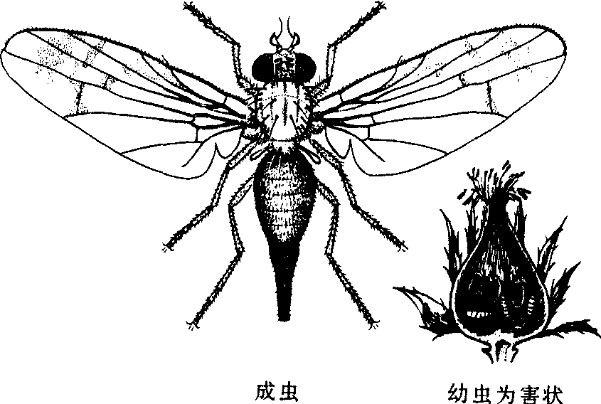 释义 | 红花实蝇safflower fly在红花等药用植物花头内取食的蝇类害虫。学名Acanthiophilushelianthi Rossi。双翅目,实蝇科。分布于印度、以色列、北非、欧洲、南北美洲及中国的宁夏、河北、甘肃、吉林、江苏、新疆、内蒙古等省区。主要为害红花,矢车菊,水飞蓟,白术等菊科药用植物20多种。受害植株花头腐烂发黑,不能开花结籽。少数被害花头虽能结籽,但种子质量大为降低。花头被害率一般为20~60%,严重者可造成毁灭性灾害。成虫灰白色,雌体长约7毫米(包括产卵管); 雄体约4.5毫米。复眼呈翠绿色,喙短阔,触角黄褐色,第三节前端尖细。头部鬃序完全,上侧额鬃2根,指向后方; 下侧额鬃3根,指向内方; 单眼鬃2根,指向前方。前胸背板上背中鬃2根,翅内鬃1根,翅上鬃2根,小盾片鬃和端鬃各2根。产卵管黑色,鸭咀形。翅白色透明,具浅褐色花斑(见图)。卵乳白色,细长。幼虫乳白色,长4~5毫米,蛆形,后气门黄褐色。蛹长约4毫米,黑色,或两端黑色,中间灰黄色。 红花实蝇 在北京年生4~5代。以蛹在寄主残株内越冬。越冬代成虫于4月中下旬出现,5~6月发生第一代,为害小蓟等杂草和野生红花,数量少且分散。6~7月发生第二代,主要为害栽培红花,数量多,为害最烈。7~8月和8~10月分别发生第三、四代,为害矢车菊属植物和白术。10月发生第五代,为害白术等晚期寄主植物,此为局部世代。第四、五代均有部分蛹越冬。宁夏年生3代,以蛹在契丹蓟花头内越冬。第二代(7、8月)为害红花,数量多,为害烈。第一、三代均为害契丹蓟。在日平均温度25℃左右,卵期3天,幼虫期6~7天,蛹期9天。成虫寿命1~11天,平均4.5天。成虫多在傍晚和夜间活动,飞翔活泼,静止时两翅不停地扇动,对光和磷酸铵液有趋性,卵数粒成堆产于花头嫩苞片内侧,幼虫在花头内蛀食苞片,小花和嫩籽,并排粪于花头内,致使花头腐烂发黑,受害花头顶端表面变黑褐色(见图)。末龄幼虫在花头内化蛹,羽化后成虫从花头顶端脱出。除成虫外,其他各虫态均在同一花头内发育成熟,幼虫无转移花头为害习性。有刺型红花受害程度低于无刺型红花。前者抗虫性较后者明显。中国春播区实行早播可避开第二代成虫的大量产卵为害,受害比晚播者显著减轻。宜实行秋播或春季早播;选育和利用抗虫品种;清园,消灭寄主植物残株,以减少越冬虫源;花蕾现白期喷洒乐果或敌百虫液,7天一次,共喷两次即可奏效。 红花实蝇safflower flyAcanthiophilus helianthiRossi,昆虫纲,双翅目,实蝇科。分布于中亚、小亚细亚(土耳其亚洲部分)、伊朗、欧洲、北非;中国分布于宁夏。寄主主要为红花、契丹蓟、苦苣等菊科植物。成虫是带花斑的灰蝇,雌蝇体长约7 mm(包括产卵管),雄蝇体长约4.5 mm。复眼翠绿,呈虹色反光。胸部灰白色,密生白色短毛,背线5条,灰色,窄细。腹部灰褐色,密生白色毛。产卵管黑色,颇长,呈鸭嘴形。宁夏一年发生3代,以蛹在契丹蓟花盘内越冬。成虫产卵于契丹蓟或红花的花上,幼虫食害籽实。在红花苗期清除附近契丹蓟草,可减少虫源;红花现蕾后发现成虫宜立即喷洒乐果或敌百虫液。 红花实蝇 |