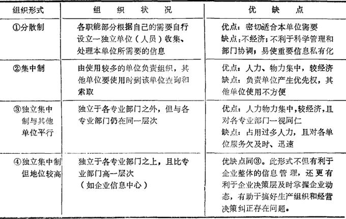 | 释义 | 信息的收集组织和贮存 1.信息的收集 信息的质量首先取决子数据收集的质量。数据收集最基础的工作是靠人工操作或自动测量装置(如利用码、信号、磁性或光学方法)进行。我国现有企业在生产经营活动中主要还是依靠人工操作方式来收集信息数据。 (1)信息收集的方法: (2)信息数据收集的基本原则: 2.信息的组织 在企业管理系统中,信息管理机构的组织可以有不同的形式(如表4-2)。 表4-2 信息组织形式