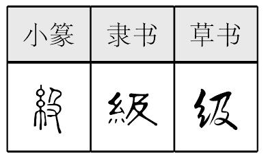 【提示】及,3画,第二笔是横折折撇; 旧字形4画,第二笔断为横折、横撇两笔。 *级(級)jí6画 糸部 (1) 等次: ~差|~别|等~|高~。 (2) 年级: 升~|留~。 (3) 量词。用于台阶、塔层等: 七~浮屠(七层的塔)|台阶只有两~。 级jí上古形声字。从纟(糹 (mì),丝),及声。本义是丝的优劣等级。后泛指等级,特指官阶爵位的品级。如:高级|低级|初级|上级|下级|等级|品级|级别|阶级。又引申为学校的年级,学校编制的名称,学年的分段。如:同级不同班|年级|班级。又指层次。如:台阶有十多级|七级浮屠(七层的塔)。 级級★繁◎常★常