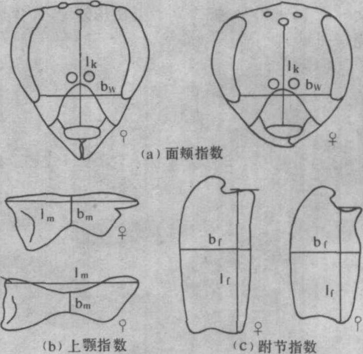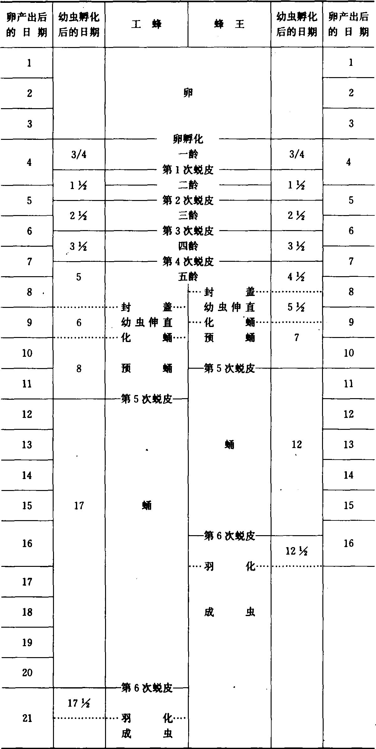 图2 工蜂和蜂王外部形态特征的3个指数(仿Berthelf,1925) 表2 蜜蜂雌性两种级型的幼虫和蛹的发育阶段(日期) 蜜蜂两种级型在发育阶段上的差异也比较明显,表2列出了蜂王和工蜂发育过程的时间顺序。所有幼虫都是在卵产下后的第3天末孵化,工蜂幼虫的巢房在第8天之后被封盖,蜂王幼虫却在7天半之后。蜂王的蛹期大大缩短。体重较大、寿命很长的蜂王从卵到成虫的发育期较短,只需16天,工蜂却推迟到21天才进入成虫期。 在室内人工培养蜂王时,经常出现中间型;为了便于区分,科技人员在鉴别蜜蜂级型的某些外部形态特征时,时常采用下列三个指数:❶面颊指数=面颊长/面颊宽(lk/bw); ❷上颚指数=上颚长/上颚宽(lm/bm); ❸跗节指数=跗节长/跗节宽(lf/bf)(见图2)。蜂王的这3个指数均较工蜂的小(见表1)。 从蜜蜂受精卵孵化出来的所有雌性幼虫在身体结构上都相同。用3.5日龄以下的小幼虫都可以培育成蜂王,而用3.5日龄以上的较大的幼虫只能培育成工蜂或具有一些蜂王特征的中间型工蜂。因而人们普遍认为蜜蜂级型产生的差异是由于哺育蜂给予雌性幼虫的饲喂和饲料质量有差异所致。工蜂幼虫在最初3天受到密集饲喂,即供给它们较多的食物,以至幼虫漂浮在食物里;但在3天以后,直到第5天末巢房封盖为止,就改为间断饲喂,每次只喂一点食物。蜂王幼虫则在整个幼虫期都受到密集饲喂,食物始终有剩余,王台封盖以后,王台里还有大量剩余食物。饲喂蜂王幼虫的王浆与饲喂工蜂幼虫的幼虫饲料在质量上也有很大差异。王浆含有较多的泛酸、生蝶呤和新蝶呤。两者含有的营养腺和上颚腺分泌物的比例也不相同。王浆中含有浓度较高的糖,可刺激幼虫体内咽侧体的发育,使其产生较多的保幼激素。蜂王幼虫咽侧体的容积平均为0.0024立方毫米,工蜂幼虫的仅为0.0017立方毫米。(见蜂王浆) 也有人认为,蜜蜂雌性幼虫两种级型的差异,是由于在生物学功能上的不同而引起的。蜜蜂级型分化的原因仍然是个有待探讨的课题。 |