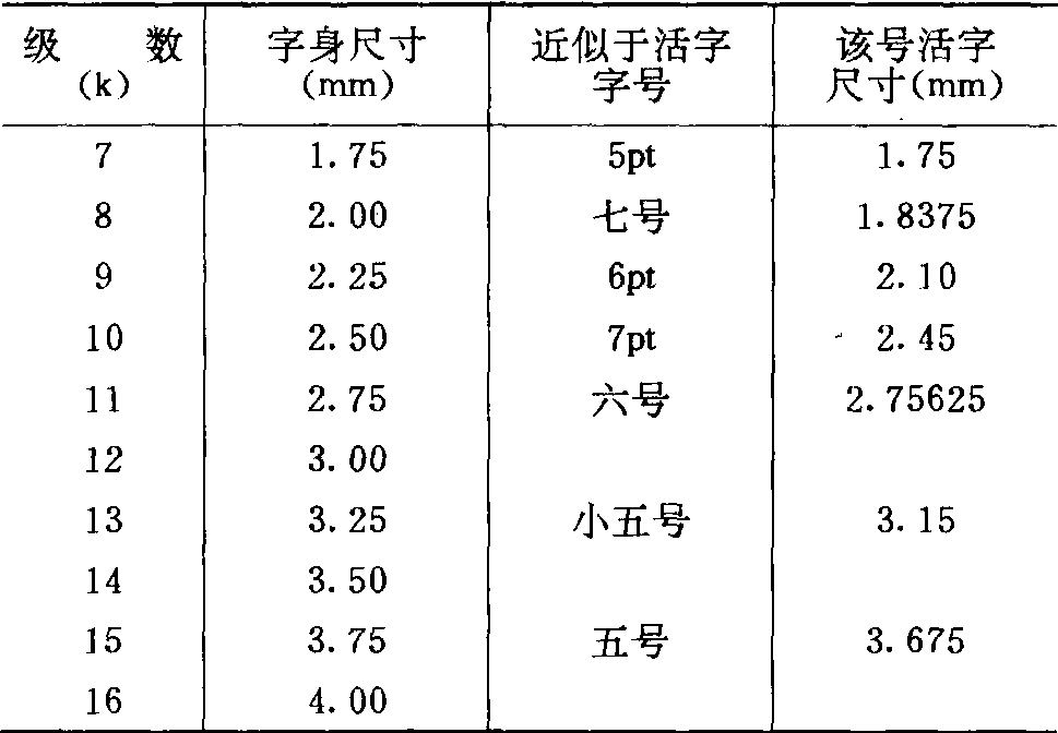 照相排版中表示字体大小的单位,称作“级”,习惯用符号“K”表示,一级等于即1K=0.25毫米。在初期的照排机上,排版的横向和纵向推送都是用齿轮来控制的,一个齿的推送量被设计为0.25毫米,即级数和齿数是一致的。在版面设计中,横向推送量用“X”来表示,1X=1K;纵向推送量用“Y”表示,1Y=1K。由于长时期人们习惯于铅活字的字号表示方法,所以在新闻出版物的排版中,也使用几种与活字大小近似的照排文字,如活字的五号字为10.5点,合3.68毫米,照排的15K为3.75毫米。而且当原稿标志铅字字号时,可根据铅字字号的点换算成级数,1点=0.35毫米。下面是照排文字的级数与活字字号的比较表: