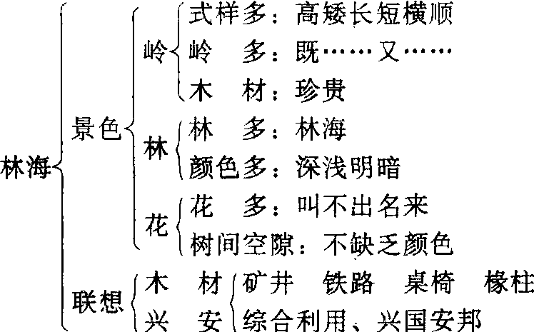 阅读教学的方法之一, 即以设计一个能够提纲挈领地概括课文内容的图表,来形象、具体地反映教材的思想内容和结构脉络,并让学生充分应用这个图表来回答问题、复述课文并贮存记忆。如教学《林海》一文,学生初读时,教师先引导学生学习课后提示,然后提出一个简单的纲要:学生审读这个纲要后,就对课文的整体有了一个认识。进而指导学生精读,让学生再进一步列出阅读提纲:从教师提出简明的纲要, 到引导学生列出具体详细的纲要,体现了“从扶到教”,从易到难,循序渐进的教学原则。使用纲要导读法,需要注意它的特点: