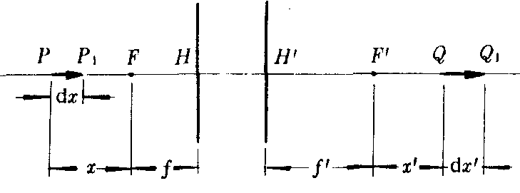 式中f和f′分别为前焦距和后焦距,x和x′分别为物、像所在处轴上共轭点的焦物距和焦像距。该式表明物离前焦点F越近(或像离后焦点F′越远)α越大;且总有α>0,即像与物沿轴取向总是相同的。可以证明,纵向放大率α与横向放大率β之间的关系是