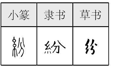 fēn紛,形声,从糸,分声,本义为马尾上的网套,假借为旌旗上的飘带,由此引申为众多、杂乱、纠纷(争执的事情)等。《简化字表》类推简作“纷”。 |