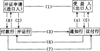 采用信用证方式结算货款,从进口人向银行申请开出信用证,一直到开证行付款后又向进口人收回垫款,其中经过多道环节,并需办理各种手续。 信用证支付的程序一般是:(1)进出口人在贸易合同中,规定使用信用证方式支付。(2)进口人向当地银行提出申请,填写开证申请书,依照合同填写各项规定事项和要求,并交纳押金或提供其它保证,请银行(开证行)开证。(3)开证行根据申请书内容,向出口人(受益人)开出信用证,并寄交出口人所在地分行或代理行(统称通知行)。(4)通知行核对印鉴无误后,将信用证交与出口人。(5)出口人审核信用证与合同相符后,按信用证规定装运货物,并备齐各项货运单据,开出汇票,在信用证有效期内,送请当地银行(议付行)议付。议付行按信用证条款审核单据无误后,按照汇票金额扣除利息,把货款垫付给出口人。 (6)议付行将汇票和货运单据寄开证行(或其指定的付款行)索偿。(7)开证行(或其指定的付款行)核对单据无误后,付款给议付行。 (8)开证行通知进口人付款赎单。信用证流转程序图解如下: