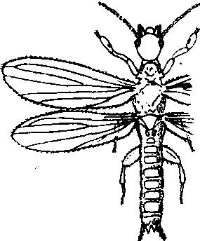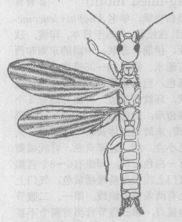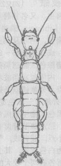 习性 卵为圆柱形,一端有盖、若虫和成虫形态相似,共4龄。初龄雄若虫翅芽隐于皮下,至后两龄若虫,翅芽外露。雄虫腹末的不对称性至若虫最后一龄方出现。一年数代。雌雄交配后,雌虫可单独在丝质隧道内产卵并抚养后代。足丝蚁的头部及胸部均能自由活动,行动敏捷,营单独或群集生活。成、若虫均能以前足在树皮裂缝或碎石间来回摆动,泌丝结成纵横交错的网,形成隧道,有的类群可聚集20多个个体。不同个体的丝质隧道重重叠叠,但又可互相沟通。一旦惊动,能迅速逃窜于隧道间。足丝蚁以植物残渣碎片及地衣、苔藓为食。 纺足目Embroptera又称足丝蚁目、𧋬目,俗称足丝蚁。昆虫纲,有翅亚纲。体小,长而扁,多暗黑色,部分具金属光泽,亦有苍白色的。无单眼。咀嚼式口器。胸部与腹部约等长。雄虫翅狭长,翅脉简单,雌虫无翅。足跗节3节,前足第1跗节极膨大,能纺丝织网。尾须2节,雄虫腹末及尾须不对称。渐变态。生活于树皮缝隙的白色薄膜状丝造隧道中,若干种类栖息于蚁或白蚁巢中,喜隐蔽,群居。主要取食死的或干植物质及菌类。雌虫有护卵习性。已知140多种,分布于热带亚热带。中国已知5种,蓝足丝蚁(Oligotoma saundersii West-wood)为常见种。 蓝足丝蚁 |