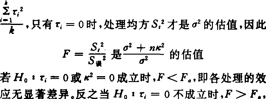 即k2>0。所谓随机模型是指试验中各处理皆抽自正态分布N(0,σ2τ)的一组随机样本,即处理效应τi是随机的遵循正态分布N(0,σ2τ),试验目的不在于研究τi本身的大小,而在于研究τi的变异程度,即σ2τ。所以,方差分析所测验的是H0:σ2τ=0,HA:σ2τ>0,统计推断的不是某些供试处理的效应大小,而是关于抽出这些处理的总体情况,这里误差均方S误2估计是σ2,而处理均方S2 估计的是σ2+nσ2r,因此