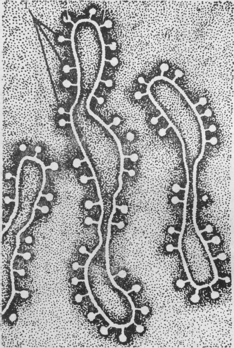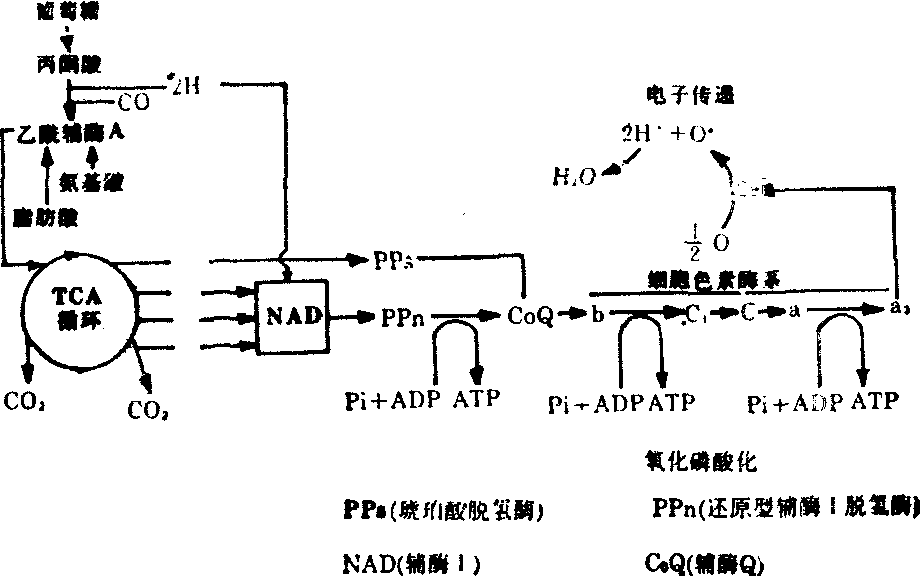 图 2 线粒体电镜图像 化学组成与功能 细胞的呼吸过程,除了糖酵解在细胞质中进行外,其余重要步骤如三羧酸循环,生物氧化和氧化磷酸化作用都在线粒体内完成,其中三羧酸循环的作用部位在基质,生物氧化和氧化磷酸化作用则在内膜上。 外膜 组成与细胞膜相似,脂类含量相对较高(蛋白质和脂类为1:1),磷脂主要为卵磷脂,其次为磷脂酰乙醇胺,磷脂酰肌醇较少,胆固醇量极微。通透性较大,水、电解质、蔗糖、尼克酰胺-磷酸核苷(NAD)和腺苷多磷酸(ATP和ADP)等及分子量小于1×104的质点都能自由通过。膜上还存在电压依赖阴离子选择通道,它是分子量3×104~3.5×104的蛋白质组成的孔道,表观直径2~4nm。阴离子(如Cl-)的通过速度较阳离子 (如K+、Na+) 为高,且当外膜电位较低(<20mV)时透性较大,较高时透性较小。其生物学意义在于呼吸作用的底物和辅助因子都是带负电荷或中性的物质,较大的有机阳离子如多胺化合物则为呼吸抑制剂,故外膜的这种选择透性有利于呼吸过程的正常进行,并且能通过内膜的生物氧化还原电位影响外膜的膜电位,从而调节呼吸作用的强度。 膜间腔 宽为6~8nm,与嵴内腔相通,腔内液体富含可溶性酶、底物和辅助因子。 内膜 蛋白质含量高(蛋白质和脂类为3.6:1),磷脂成分特殊,心磷脂含量超过20%,且有不少酸性磷脂; 不含胆固醇,但含有多量的醌类分子,约有50%的内膜蛋白是参与生物氧化和氧化磷酸化作用的酶和辅助因子,其余的膜蛋白则为各种物质的运输载体。内膜(以及外膜)上还有能识别由细胞质核糖体合成的线粒体组成蛋白质的特异受体,它能与该蛋白质前端的导肽结合,并根据导肽的信号而将该蛋白质分别分布在外膜、膜间腔、内膜内外侧或基质。 由于内膜的通透性比外膜小,很多物质均需依靠,特定的载体和通过不同的运输机制才能出入膜内基质。其中有些载体适应某种穿梭机制而起作用,如肉毒碱载体用于携带长链脂肪酸进入基质,而α-酮戊二酸和谷氨酸-天冬氨酸载体则用于将还原型尼克酰胺-腺嘌呤核苷(NADH)的还原力输入基质内,才能转化成ATP的高能键。 参与呼吸衔接作用的内膜蛋白自然形成5个酶复合体(见表),它们相互衔接、协调而组成生物氧化作用的电子传递链和氧化磷酸化作用的偶联因子。 线粒体内膜蛋白组成的复合体