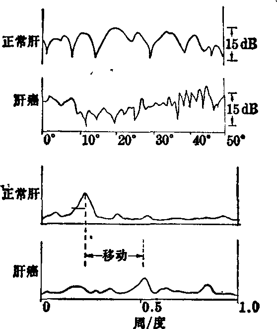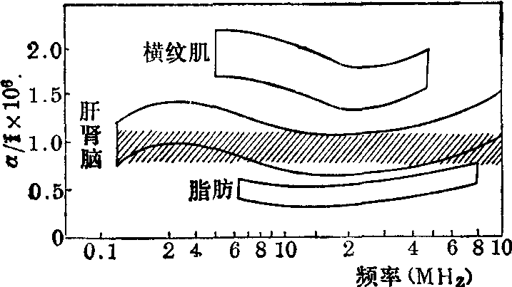 表2是一些生物组织界面的反射率的数值。表2 一些生物组织界面的反射率(以低于全反射器反射率的分贝数表示,注*的界面无实际意义) 对于各种声学测量来说衰减系数α和超声传播速度c是二个基本物理量。超声波通过真实介质时它的强度是传播距离的函数,随着传播距离增大,强度亦随之下降。造成这种衰减现象的因素有: ❶波束扩展导致单位面积的能量下降。 ❷散射作用使一部分能量偏离原来的传播方向。 ❸波的模式改变,导致能量在具有不同波速和不同传播方向的波之间进行重新分配。 ❹吸收过程,超声能量转变为热。在具有衰减作用的真实介质中一列沿x方向传播的平面波的振幅可表示为: Ax=A0e-αx (6)其中A0是在x=0处波的某一变量的振幅,如声压振幅、质点速度振幅或密度振幅。Ax为同一变量在x处的峰值。α为振幅衰减系数,其量纲为[L-1]。如果只讨论吸收作用的贡献,α为振幅吸收系数。Stoke-Kirchhoff经典吸收系数为: ![]() 从第二项中可以看出,如果频率很低,波的周期远大于能量转移所需要的时间,则第二项便是常数,其值为B。如果频率很高,波的周期远短于能量转移所需要的时间,能量未从波动过程中被抽提出来,后一项消失,仅留下经典项。此外,只发生一个弛豫过程的情况是不多的,为了描述观察到的吸收谱,必须考虑几个弛豫过程,并将它们相加起来 图2表示由实验测量求得的生物材料的超声衰减系数与频率的关系。以每周的衰减相对于频率的对数作图。 图2 哺乳动物组织每个波长的声振幅衰减(dB/cmMHz)系数与频率的关系 经典理论指出,如果衰减仅由吸收引起,则出现一线性关系(斜率为正)。由图可见在所考察的频率范围内每周的衰减一般是恒定的。哺乳动物肾组织的这种衰减与频率的依赖关系约持续到100MHz附近。此后以二次方关系占优势。脂肪的α/f值在1MHz~10MHz范围内略有随频率上升的趋势。横纹肌及肝组织的α/f值在2MHz附近有一最小值。在介质对超声的衰减作用中有一部分是属于散射作出的贡献。如果靶体远小于超声波长,全部散射波向各方向均匀地散布(复杂结构的散射是它的组成单元散射的矢量和,这些组成单元必须足够地微小),血细胞对超声的散射作用便属于这一类型。如果超声频率低于15MHz,血细胞的直径远小于波长。例如频率为5MHz时波长为0.3毫米,而红细胞的平均半径仅为2.75μm。这类散射是角相关的。考虑到血浆的粘滞性,血细胞的角散射用Ahuja公式描述: ![]() ![]() ![]() 图3 组织的Bragg反向散射衍射图 主要贡献的是红细胞。另外这类散射也与频率相关的。在5MHz~15MHz范围内低血细胞比容全血的超声反向散射系数与超声频率的四次方成正比,符合瑞利散射理论。红细胞的15MHz超声散射截面约为它的几何投影面积平均值的10-4倍。血流中红细胞的超声散射是血流的超声多普勒信号源。通过测量软组织的超声散射频谱及超声反向Bragg衍射,可以研究散射能量与组织结构之间的关系(图3,下两图系对应于上两图的功率谱)。☚ 超声生物物理学 次声的生物效应 ☛ |
