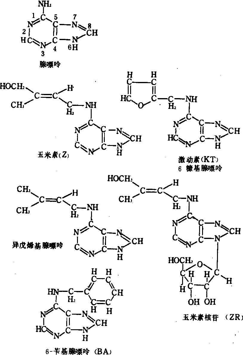 释义 | 细胞分裂素cytokinins一类具有腺嘌呤环结构的植物激素。其共同特点是在腺嘌呤环的第6位置氨基上有特定的取代物。这类物质的生理功能突出表现在促进细胞分裂和诱导芽形成。1948年美国斯科格(F.Skoog)和中国崔澂在烟草组织培养中发现腺嘌呤能诱导烟草髓组织分化出芽。1955年米勒(C.D.Miller)等以酵母DNA的降解物和鲱精子的DNA中分离纯化得到促进细胞分裂的物质,定名为激动素(KT)。按其化学结构即6-呋喃甲基腺嘌呤,又称6-糠基腺嘌呤。1963年莱瑟姆(D.S.Letham) 从受精11~16天的玉米嫩籽中分离出第一种存在于高等植物的天然细胞分裂素,定名为玉米素(Z)。目前已从高等植物中得到20几种腺嘌呤衍生物,具有与激动素类似的生理活性。植物体内除玉米素以外存在较普遍的有二氢玉米素、玉米素核苷(ZR)和异戊烯基腺嘌呤等(见图)。近代人工合成了多种类似物质,如6-苄基腺嘌呤(BA)、四氢吡喃苄基腺嘌呤(PBA)等。这类物质通称为细胞分裂素(CTK)。 几种细胞分裂素的化学结构 形成部位和分布 根部是合成细胞分裂素的重要场所,幼叶、芽、幼果和正在发育的种子中也能形成CTK。细胞分裂素主要分布在植物的幼嫩组织中。例如,玉米素最早是从未成熟的玉米籽中获得,在乳熟的甜玉米中还分离出玉米素核苷,从正在发育的豌豆中得到异戊烯基腺苷,未成熟的黄羽扇豆中获得二氢玉米素。成熟种子和干种子中均测不出CTK活性,当种子萌发时这类激素又重新出现。从正在生长中的果实,如苹果、番茄、梨、桃等的幼果中都能测得多种细胞分裂素。当传粉受精后,在幼果细胞分裂最旺盛时期CTK的含量最多; 细胞分裂将结束时,其含量急剧下降。关于根内细胞分裂素的分布情况,已经了解到向日葵和豌豆的根端含有丰富的CTK,而老根中无CTK活性。 生理效应 ❶促进细胞分裂。细胞分裂有两个过程,一是核分裂过程,另一是胞质分裂过程。细胞分裂素能促进胞质分裂。如果缺乏CTK,则细胞不能正常分裂而形成多核细胞。 ❷诱导芽形成。在组织培养中CTK对芽的形成有显著的促进效应。有些离体叶经KT处理后主脉基部及叶缘都能产生芽。 ❸防衰保绿。CTK能延缓器官衰老,用KT处理离体叶片,可以逆转处理区域内蛋白质和叶绿素的降解过程,达到防衰保绿的效果。 ❹克服顶端优势。将KT施于受茎顶端极性运输的生长素抑制的侧芽上,可使侧芽萌发生长。此外,CTK还具有促进番茄花芽形成,加速莴苣、烟草等种子萌发,使遗传上雄性葡萄品种变为雌雄同花植株等效应。 应用 BA(5~10ppm)可用于菠菜、芹菜、莴苣等蔬菜,使其叶片延缓失绿,以延长销售时间。用于水仙、紫罗兰等花卉,可延长切花寿命。多种植物在组织培养中,细胞分裂素与生长素药剂以适当比例配合应用时,能促使组织分化出芽和根,长成完整植株。此外,还可应用5~10ppm BA浸泡黄豆或绿豆,使豆芽肥嫩、根短,提高食用价值。 细胞分裂素cytokinin,CTK具有腺嘌呤环结构,能促进细胞分裂和芽分化的一类植物激素。1963年莱瑟姆(D.S.Letham)从嫩玉米籽粒中分离并鉴定了第1种天然细胞分裂素,定名为玉米素。目前已从高等植物中获得20余种具有类似生理效应的腺嘌呤衍生物。如二氢玉米素、玉米素核苷和异戊烯基腺苷等。细胞分裂素的通式如下。细胞分裂素具有促进细胞分裂,诱导芽的分化,促进侧芽发育,延迟叶片衰老,打破某些种子的休眠等生理效应。根部是合成细胞分裂素的主要场所。人工合成的有6-苄基腺嘌呤和6-糠基腺嘌呤(又名激动素)等。常用于组织培养和蔬菜保鲜。 细胞分裂素 细胞分裂素xibaofenliesu亦称“细胞激动素”。一类植物激素。1955年美国斯库格(Skoog)等在研究植物组织培养时,发现了一种促进细胞分裂的物质,被命名为激动素。它的化学名称为6-糠基氨基嘌呤,纯品为白色固体,能溶于强酸、碱中。激动素在植物体中并不存在。之后在植物中分离出了十几种具有激动素生理活性的物质。现把凡具有激动素相同生理活性的物质,不管是天然的还是人工合成的,统称为细胞分裂素。它们的基本结构是有一个6-氨基嘌呤环。植物体内天然的细胞分裂素有玉米素、二氢玉米素、异戊烯腺嘌呤、玉米素核苷、异戊烯腺苷等。它们在体内合成的部位主要是根尖。人工合成的细胞分裂素除了激动素外,还有6-苄基氨基嘌呤等。细胞分裂素最明显的生理作用有两种:一是促进细胞分裂和调控其分化。在组织培养中,细胞分裂素和生长素的比例影响着植物器官分化,通常比例高时,有利于芽的分化;比例低时,有利于根的分化。二是延缓蛋白质和叶绿素的降解,延迟衰老。各种细胞分裂素的活性有差异,例如在促进生长的生物试验中,天然的细胞分裂素如玉米素、异戊烯腺嘌呤,比人工合成的细胞分裂素如6-苄基氨基嘌呤和激动素高,而在延缓叶绿素分解的生物试验中,后者活性比前者高。 图544 细胞分裂素通式 图545 激动素结构式 图546 玉米素结构式 ☚ 赤霉素 脱落酸 ☛ 细胞分裂素又称“细胞激动素”。是一类腺嘌呤的衍生物。为DNA的降解产物,或人工合成。具有促进细胞分裂和调节分化,延缓蛋白质和叶绿素的降解,从而延迟植物衰老的作用。如激动素、玉米素、6—苄基嘌呤等。 细胞分裂素植物激素之一。参见“细胞”中的“细胞分裂素”。 |