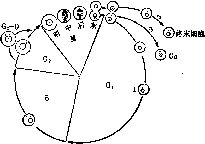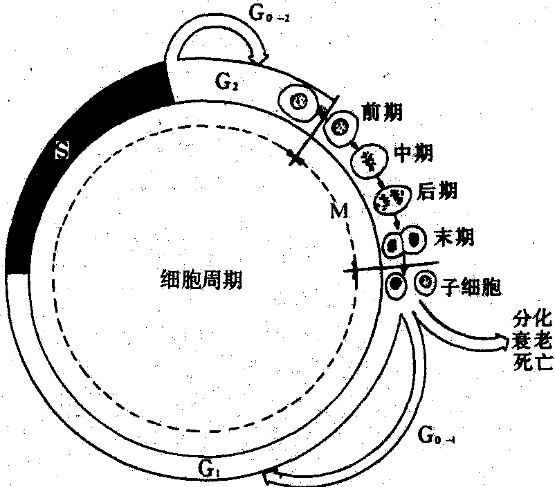 释义 | 细胞周期cell cycle自亲代细胞分裂完成到子代细胞分裂结束所经历的一个完整细胞世代。亦称细胞生命周期或细胞生殖周期,包括分裂间期和分裂期。长期以来由于在形态学上不易看出间期的明显变化,而被认为是静止的细胞。50年代以来,由于多项新技术的应用,证明间期细胞进行着极其复杂的生物学变化。细胞周期与个体发育、细胞分化、生长、再生、创伤修复、细胞老化、肿瘤发生与治疗等均有密切关系。 细胞周期示意图 DNA复制前期(G1,第一间隙期) 哺乳动物G1期长度差别很大,从几小时、几天以至几个月。细胞分裂周期的长短变化与G1有关。此期细胞内进行着一系列极其复杂的生物合成过程,为DNA的复制和蛋白质合成作准备。开始阶段环鸟苷酸(cGMP) 先合成,随后与环腺苷酸(cAMP)相间形成; 初期阶段积极合成RNA,包括mRNA、rRNA及tRNA,它们经核孔进入细胞质内,决定细胞合成其特异性蛋白质和酶,初期也积极吸收氨基酸和糖,继之合成蛋白质和多糖; 中期形成多胺; 后期积累合成DNA前体物——脱氧核苷酸及胸苷激酶等;末期中心粒分离,为中心体复制作准备,此期的细胞质内还形成启动DNA合成的物质。G1期可再细分为变动期和固定期,在两期之间有一个R调控点,即细胞是否进入S期的决定时期。所有分裂后的子细胞都先进入G1期的变动期,只有向S期继续前进的细胞才进入G1期的固定期。动物细胞进入G1期后,因细胞种类、分工不同有3种不同的途径: ❶细胞不能继续增殖分裂。通过分化成为执行一定机能的细胞,直至衰老、死亡,如神经细胞、角质细胞和成熟红细胞等; ❷细胞暂时离开细胞周期进入暂时休止状态。当组织内的细胞大量损伤而需要增殖补充时,它们又重新进入周期。此类细胞称非增殖细胞或G0期细胞; ❸细胞继续增殖,离开G1期进入S期,并通过其他各期完成细胞分裂,如骨髓细胞、消化道粘膜上皮细胞等。 在个体发育过程中的细胞是继续分裂,还是进行分化,首先由内因决定,即受基因支配,同时也受环境条件的影响。 DNA合成期(S) 从G1末期到S期初期,细胞内急剧形成DNA聚合酶和四种脱氧核苷酸。S期初期鸟嘌呤及胞嘧啶含量大,后期则是腺嘌呤及胸腺嘧啶含量大。在S期内,RNA聚合酶很活跃,RNA量也倍增,当RNA合成受阻时,DNA复制也会受阻。DNA首先在常染色质内复制,后期则主要在异染色质内复制。S期末,DNA量倍增,从而保证分裂后子细胞内遗传物质的平均分配。S期的重要意义在于染色体的精确复制。组蛋白是形成新染色质的材料,亦在S期内合成。 DNA合成后期(G2,第二间隙期) 是细胞分裂前的最后一个准备步骤,持续时间较短。此期只进行少量RNA和蛋白质的合成,包括微管蛋白的合成,它为M期纺锤丝微管的组装提供原料。在G2晚期开始出现有丝分裂因子的合成,它为M期染色质凝聚作准备。如果抑制G2期的蛋白质合成,细胞就不能进入分裂期。 分裂期(M) 其特点是RNA合成停止,蛋白质合成减少,染色体高度螺旋化并准备一分为二。细胞进入分裂期后即严格按前期、前中期、中期、后期和末期的程序进行(见有丝分裂)。 原核细胞与真核细胞一样也具有细胞周期,可分为启动期、合成期和分裂期。 细胞周期调控 关于细胞周期的调节控制机制,已知有下列因子。 DNA合成诱导者 当将S期的细胞核移到另一G1期的细胞质内时,DNA合成停止; 如将G1期或M期的细胞核移到另一S期的细胞质内时,则这些核出现DNA合成。证实S期的细胞质内出现一种促进DNA合成的蛋白质因子,称DNA合成诱导者。在非S期的细胞质内无此因子。 有丝分裂因子 在G2末期和M期的细胞质中存在有丝分裂因子,当它们与间期细胞融合时,会引起间期细胞染色体提早凝集。有丝分裂因子对任何种属细胞均起作用,甚至远缘动物细胞结合时也有效。 R调控点因子 G1期的调控点是细胞增殖的重要环节。G1期细胞能合成一种不稳定蛋白质(u-蛋白),当其数量在细胞内达到一定阈值时,细胞便可通过调控点,从而促进DNA合成和细胞分裂。任何蛋白质合成的抑制剂均会抑制u-蛋白的产生,进而抑制DNA合成和细胞分裂。 cAMP和cGMP 它们不仅能调节各类细胞的生理活动,而且对细胞周期有调控作用。当细胞内cAMP含量增高时,细胞增殖率下降; 减少时,细胞增殖率却上升。cGMP在活体细胞中浓度很低,提高细胞内的cGMP的水平,可以促进核酸和蛋白质的合成以及细胞分裂,故认为cAMP对细胞增殖有负效应而cGMP则有正效应。 生长抑素 一种细胞群体本身所产生的多肽。它具有严格的组织特异性,而没有种属特异性。目前已知有十几种,常见的有表皮、淋巴细胞、肝等生长抑素。它在体内或体外都能抑制同类组织细胞的有丝分裂,这种抑制是可逆的,对细胞没有损害,而且可将细胞抑制于周期的各个时期内。其作用机理目前认为是激活了腺苷酸环化酶的活性,从而提高细胞内cAMP的浓度。 细胞周期对环境中的氢、钾、钙等离子的浓度亦是敏感的。 细胞周期的测定 在不同生物或同一生物的不同组织间存在明显差异,不仅全周期与各期的长度不同,而且各期的生化变化也不一致。测定细胞周期的方法很多,包括应用装有显微电影摄影装置的相差显微镜直接观察活细胞,并按一定间隔时间拍摄各期的时长,即缩时电影技术。目前一般采用3H标记的胸腺嘧啶核苷(以3H-TdR表示)掺入细胞DNA的放射自显影方法。3H-TdR是DNA的前躯物,具有专一性,只能掺