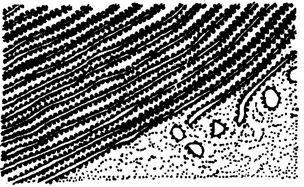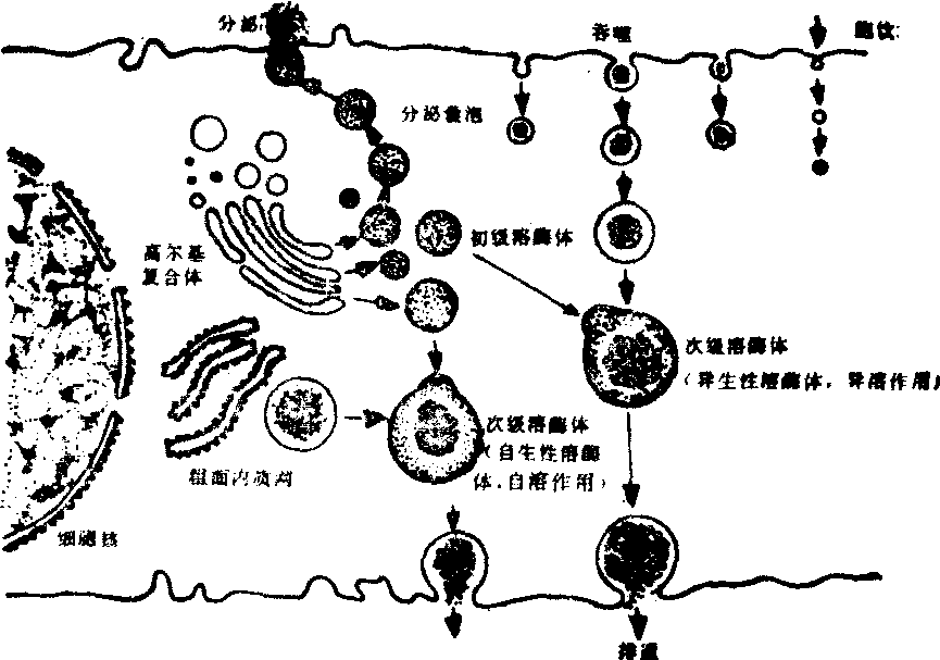 释义 | 细胞的超微结构 细胞的超微结构在光学显微镜下,细胞的内部结构被粗略地分为细胞膜、细胞质和细胞核三部分,对细胞内部的细节观察受到了限制。应用电子显微镜(电镜)才能研究细胞的超微结构,在电镜下发现细胞主要是一些膜性结构,如线粒体、高尔基体、内质网、核被膜及细胞膜等。细胞靠这些膜性结构,将各种酶分子隔离开来,避免相互混杂,以保证细胞代谢作用的正常进行。细胞的这种由膜性细胞器,将功能相近的酶系分隔于一定区域内的作用,便是细胞内膜系的区域化作用。 图1 单位膜模型图 图2 液态镶嵌模型图 目前较为公认的膜结构理论为液态镶嵌模型(图2),即在液态的类脂双分子层中,镶嵌着可以移动的球型蛋白质。蛋白质分为外在蛋白质和内在蛋白质两类。内在蛋白质镶嵌在类脂的双分子层中,其中有的埋在类脂的内层,有的埋在外层;外在蛋白质附着在类脂双层的内层表面,常与内在蛋白质的内侧表面以离子键相连。内在蛋白质的位置改变,可以影响外在蛋白质的功能,而外在蛋白质的收缩也可影响内在蛋白质的分布。在一般情况下,膜的类脂大多数处于液晶状态,这就使膜具有较大的流动性。实验证明,类脂和蛋白质在膜的流动结构中,能作一定程度的自由运动,如蛋白质分子在膜中可做侧向运动,内层的类脂分子可以移向外层等。生物膜的流动性使膜中的蛋白质能够适应功能的变化而改变其分布与结构,从而保证了细胞完成各种不同的生理功能。现已发现细胞的吞饮与吞噬作用,细胞分裂与细胞融合以及神经突触释放递质的作用等,皆与膜的流动性有关。 细胞质 细胞质中除去特化的部分——各种各样细胞器(核糖体、内质网、高尔基体、线粒体和溶酶体等)之外,剩下的是胶态物质,即细胞质基质。基质中含有若干种酶(糖酵解酶系,与氨基酸合成和分解有关的酶系等),中间代谢产物,以及储存的脂质、糖原等。细胞质基质也在不断地进行新陈代谢活动。 核糖体 核糖体又称核蛋白体,在电镜下为15—25nm的致密小颗粒,是由核糖体核糖核酸(rRNA) 与蛋白质结合而成的,其中rRNA约占60%,蛋白质约占40%。现已知道核糖体是由大小两个亚单位构成的。哺乳动物细胞核糖体的大小两个亚单位的沉降系数分别为60S和40S。核糖体可以附着在内质网的表面上,也可游离于细胞的基质之中。不论是附着的或是游离的核糖体,皆可由信使核糖核酸(mRNA) 细丝串联成为多聚核糖体或称多聚体(图3、4)。多聚核糖体在电镜下呈花簇状或 螺旋状的集合体,一般由3—30个核糖体组成。核糖体是细胞内蛋白质合成的基地,也可譬喻为“装配”蛋白质的机器。附着于内质网的核糖体主要合成外输蛋白,而游离核糖体主要合成供细胞本身生长所需要的结构蛋白。 图3 多聚核糖体 图4 核糖体组成成分示意图 内质网 内质网是细胞质中的膜性管道系统,普遍存在于一般细胞之中,但其数量各有不同。根据其表面有无核糖体的附着,可分为两种类型,粗面内质网 (rER)和滑面内质网(sER)。粗面内质网的主要特征是表面附着核糖体。粗面内质网常见于蛋白质合成旺盛的细胞之中,多为扁平囊状,彼此平行地密集在一起。粗面内质网的主要功能是合成外输蛋白(或称分泌蛋白),也合成少量细胞自身所需的结构蛋白 (结构蛋白主要由游离的核糖体合成)(图5)。核糖体是蛋白质合成的场所,膜性管道则是新合成蛋白的运输通路(图6)。 图5 粗面内质网(膜上小颗粒为核糖体) 图6 粗面内质网的蛋白质合成示意图 滑面内质网一般都呈小管状,或小泡状,表面光滑,没有核糖体附着。不同细胞内的滑面内质网,具有不同的功能,如具有解毒,运输脂类,传导兴奋,分泌盐酸等作用。两型内质网在各种细胞的分布是不一样的。有的细胞粗面内质网很发达,如胰腺细胞、浆细胞等; 有的细胞富于滑面内质网,如平滑肌细胞、胃腺的壁细胞等; 有的细胞两者兼而有之,如肝细胞。内质网的出现,一方面把细胞质基质分隔成若干不同区域,使细胞内物质代谢能够在特定的环境下进行,另一方面也扩大了细胞内代谢活动的“表面”,而使各种反应得以高效率地进行。 高尔基体 高尔基体又称高尔基器,位于细胞核附近,其形态呈网状,所以也叫内网器。在电镜下高尔基体包括扁平囊泡、小泡和大泡三种成分。扁平囊泡又叫高尔基囊泡,由3—8个扁平囊泡平行排列在一起,形成高尔基体的主体。扁平囊泡一般略弯曲而呈弓形,其凸面为生成面,凹面称成熟面或称分泌面。在有极性的细胞中,形成面朝向细胞基底部,成熟面则面向细胞表面。成熟面的膜上附有酶,能够促使分泌物的浓缩和成熟。小泡常见于形成面和扁平囊泡周围,数目较多。一般认为小泡是由粗面内质网出芽生成的,其中充满蛋白质分泌物,并不断地向扁平囊泡并入。大泡一般为数个,常位于扁平囊泡的成熟面,是扁平囊泡末端或成熟面的膨大部分。大泡带着由扁平囊泡生成的分泌物,形成分泌囊泡离开高尔基体(图7)。扁平囊泡由于小泡的不断并入和大泡的经常脱离,而处于动态的变化中。高尔基体参与细胞分泌物的储存和加工活动。具有分泌作用的细胞中,高尔基体皆较发达。粗面内质网合成的蛋白质(或称分泌蛋白)在高尔基体内储存,经过脱水缩合,加入糖类物质之后,再被转运到细胞之外。 图7 高尔基体 线粒体 在电镜下,线粒体是由内外两层膜(即两层单位