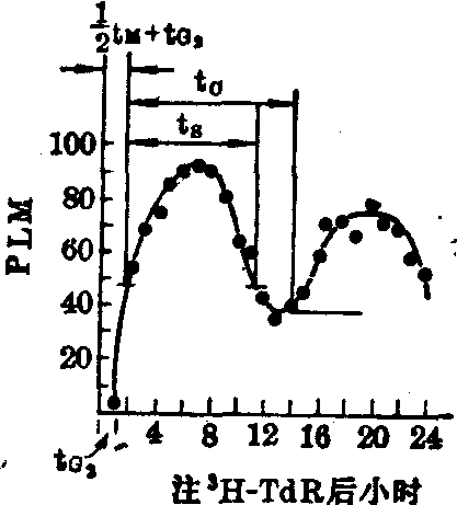 有时细胞可脱离增殖周期,称为G0期细胞,但仍保持其原有代谢特征。有些G0期细胞在一定条件下又可重新进入周期而增殖,有些则终止于G0期,最后趋于死亡。有些癌的G0期细胞对放疗、化疗不敏感,往往成为复发的根源。 细胞增殖的动力学参数: 反映细胞增长规律的主要参数,除细胞周期各期的时间最为重要外,还有: IM: 有丝分裂指数,也记为MI。 Is: 3H-胸腺嘧啶核苷处理后的标记指数,也记为LI或IL。 Ip: 增裂分数,表示细胞群体中有增殖能力的细胞分数,也记为GF。 KB: 平均新细胞出生率。 KG: 平均细胞增殖率。 KL: 平均细胞丢失率,KL=KB-KG。 tL: 细胞平均寿命,表示细胞出生到衰老死亡、丢失的平均时间。 测定细胞动力学参数的核素示踪方法 测定细胞动力学参数的方法很多,核素示踪法是其中很重要的一类,它的几个有代表性的方法如下: (1)标记有丝分裂百分数法: 简称PLM法,是测定细胞周期时间应用最广的一种方法。其原理是: 3H-胸腺嘧啶核苷(3H-TdR)与待测细胞作短暂接触 (一次注射或短期体外培养),使在该段时间内正处于S期不同阶段的全部细胞中DNA被2H标记,而当时处于其他时期的细胞则不带标记。在多余的3H-TdR被除去后的不同时间取样作细胞放射自显影,找出正处于有丝分裂的细胞,计算其中带3H标记的细胞占有丝分裂细胞的百分数。由于S期细胞需经过G2期才开始有丝分裂,故开始一段时间标记有丝分裂百分数为零(见图2.a)。当开始出现标记有丝分裂细胞时,表示原来处于S期最后阶段的细胞已渡过G2期进入M期,故这一时间间隔即为tG2 (见图2.b)。 此后原处于S期其他阶段的细胞陆续进入M期,标记有丝分裂百分数逐渐上升,达到最高点时,说明原处于S期末阶段的细胞已完成有丝分裂而进入G1期,故从开始出现标记有丝分裂细胞到开始出