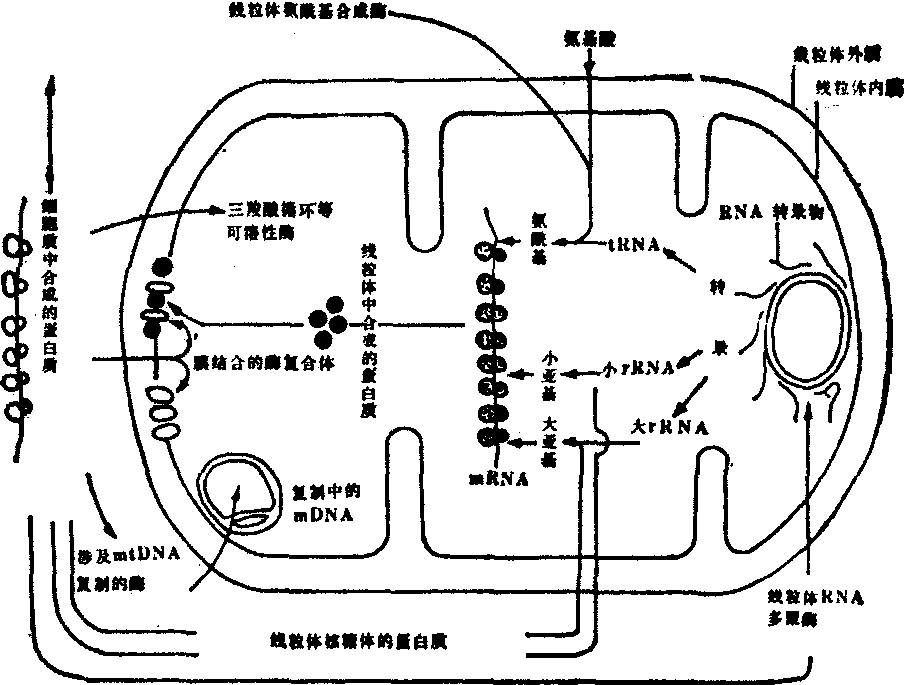 根据对酵母菌、链孢菌、衣藻、有爪蟾蜍、小鼠和人等不同物种线粒体基因活性的研究,已知由mtDNA编码线粒体中的rRNA、tRNA和少量蛋白质基因,在线粒体核糖体上合成蛋白质。但另外还有许多蛋白质由核基因组编码,在细胞质核糖体上合成,然后输入线粒体与线粒体蛋白质共同建造结构,执行功能。但两者的遗传系统是分开的。线粒体有独立的蛋白质合成体系。实验证明:从细胞中分离出来的线粒体能在短期内继续进行DNA复制、转录和蛋白质合成;在整体细胞实验中加入蛋白质合成抑制剂,如环己胺(cycloheximide)抑制细胞质中蛋白质的合成,但对线粒体核糖体无影响,如果加入抗生素(氯霉素、四环素或红霉素)则抑制线粒体的蛋白质合成,对细胞质的蛋白质合成无影响。 线粒体基因组 酵母菌线粒体基因组包括2种rRNA基因,约30种tRNA基因和8种mRNA基因,其中7种为线粒体内膜蛋白质,1种为线粒体核糖体蛋白质。1981年Anderson等发表了人类线粒体DNA16569个核苷酸对的全部序列。其基因组含2个rRNA基因,22个tRNA基因和13个未鉴定的读码(URF)。在13个URF中有5个为有功能的蛋白质:3个细胞色素氧化酶亚基,1个ATP酶,1个为细胞色素b。1985年有人报告在其余的8个URF中6个是呼吸键NADH脱氢酶。人类mtDNA几乎全部用于rRNA和蛋白质的基因编码,与细菌基因组相似,未发现有非编码的间隔顺序(即内含子)。这一点与酵母菌不同,酵母菌的mtDNA中有大片段的内含子。牛和小鼠线粒体的基因组顺序与人类相似(图1) 图1 人线粒体基因组 线粒体基因转录 人和小鼠的线粒体基因组中只有两个启动因子,一个位于H链,一个位于L链,其位置接近复制起点。从该处开始以两条链为模板分别沿双链的全长转录,合成两条不间断的RNA单链。这种转录方式为对称转录。核基因转录与此不同,主要以一条链为模板,而不对称转录。线粒体基因产物大部来自H链,转录后的RNA经核酸酶切割加工,产生2个rRNA,多数tRNA和约10个具有多聚腺苷酸(polyA) 的RNA分子。L链转录产物加工后产生8个tRNA和1个含少量polyA的RNA分子。其余90%为无用信息被降解。含polyA的RNA推测是线粒体的mRNA,其5′端缺少加帽。3′端带1个约55个核苷酸的polyA尾巴,是转录后由poly A多聚酶加添的。酵母菌线粒体基因组有大量内含子,有分开的启动因子。几乎全部基因从一条链转录,无对称转录证据。 线粒体mRNA 的翻译 翻译过程与大肠杆菌相似。蛋白质合成从N-甲酰蛋氨酸开始。线粒体mRNA因缺乏5′端和3′端的非编码区,相邻基因之间无间隔,核糖体如何与之结合而开始翻译尚不了解。mRNA的3′端更简略,翻译至任一终止符号立即停止。线粒体的一个终止符号为UAA,但许多mRNA中UAA是在转录后加添的。据模板核苷酸顺序分析,原始转录物切割后mRNA的3′端有U或UA,加添polyA后形成终止密码UAA,可见线粒体基因组编码之简练。线粒体核糖体与细胞质核糖体相似,含大小两个亚基,各亚基由蛋白质和rRNA组成。线粒体核糖体沉降系数为55S,比细胞质核糖体低。两亚基沉降系数分别为39S和28S,前者的rRNA分子为16S,后者为12S。线粒体中无细胞质核糖体的5S和5.8SRNA分子。线粒体tRNA与细胞质tRNA形态相似,结构和功能上存在重要区别。线粒体tRNA含59—75个核苷酸,有少数修饰碱基。比细胞质tRNA更有易变性。线粒体的某些氨酰tRNA与细胞质中的读码不同,线粒体的遗传密码与“统一遗传密码”表的差别见表2。 表2两种线粒体遗传密码与“统一遗传密码”比较 此外AUA和AUU也与AUG同样可用作起始密码。N-甲酰蛋氨酸是所有多肽链合成的第一个氨基酸。 叶绿体的遗传 叶绿体是绿色植物进行光合作用的细胞器,其结构为双层膜包裹的片层系统,内部包括许多由小片层构成的基粒,基粒之间为基质(见“叶绿体”条)。1970年有人用渗透震荡法(Osmotic shock) 研究伞藻(Acctabularia)的叶绿体,发现最完整的DNA片段长约419μm,约含1.23×106碱基对。一般高等植物的叶绿体DNA(简写cpDNA)为环形的双螺旋结构,分子量约85×106—97×106,相应为1.3×105—1.5×105碱基对,在叶绿体基质中也呈簇状分布。cpDNA的复制与叶绿体的分裂贯穿于整个细胞分裂间期。叶绿体与线粒体相似有全套的遗传体系,有自己的RNA和核糖体。其核糖体也对某些抗生素敏感,对细胞质的蛋白质合成的抑制剂无明显效应。叶绿体本身具有特定的表型性状,如绿色和光合作用的能力等。 cpDNA比mtDNA复杂,与细菌的遗传系统更相近,cpDNA和叶绿体mRNA能在细菌的转录一翻译系统中精确地进行转录和翻译,甚至可在杂交核糖体上进行蛋白质合成。所谓杂交核糖体是指叶绿体的核糖体小亚基与细菌核糖体大亚基的结合物。叶绿体核糖体的亚基与同一有机体的细胞质核糖体亚基则不能结合,说明叶绿体核糖体与细胞质核糖体的遗传体系不同。叶绿体合成蛋白质也与线粒体和细菌相似从甲酰基蛋氨酸开始,合成后在酶的作用下切除。 在高等植物中,花粉中的叶绿体不进入合子并保持严格的母体遗传者,大约占2/3。其余植物有的花粉叶绿体也进入合子。这样,细胞质遗传的性状可来自双亲。例如植物的杂色叶,即合子中有正常的叶绿体和缺陷型的叶绿体。通过生长过程中的细胞有丝分裂,叶绿体逐渐分离,产生两种含不同叶绿体的细胞,使叶面上出现绿色和白色斑块。绿色斑块的细胞中含正常叶绿体,白色斑块中含缺陷型叶绿体,说明叶片颜色决定于细胞质而不是决定于细