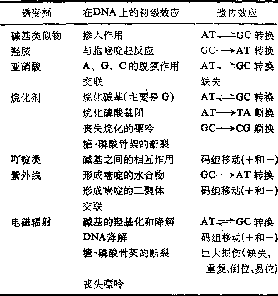 几种常用诱变剂的诱变功能表