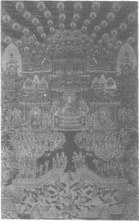 释义 | 织锦极乐世界图轴 织锦极乐世界图轴清,纵448厘米,横196.5厘米,画心高289厘米,宽175厘米。北京故宫博物院藏。“极乐”是佛土名称,即阿弥陀佛的国土,又作安养、安乐、无量清净土、无量光明土、无量寿佛土。此图轴织锦地组织为三枚左向经斜纹。花纹组织为三枚左向纬斜纹组织。经线密度每厘米50根,纬直径为0.2—0.25毫米。在石青地上,以红、蓝、绿、橘黄、橙水红、香色为主,配以近20种不同颜色的彩色丝线,运用颜色平涂上色,细线勾勒,彩色纬丝显花的方法,形成青蓝基调上的鲜明对比。在对比色相接地方,采用浅色相间,墨线勾边,使画面深、浅、明、暗起伏变化。织锦极乐世界图轴,以极其丰富的想象力描绘西方佛国的种种情景,画面中心是佛祖阿弥陀佛,在阿弥陀佛前面稍下的位置,左右各有一菩萨,一是观音菩萨,一是大势至菩萨,也有人说一个代表未来,一个代表过去。阿弥陀佛、观音和大势至都打坐于有宝装华锦的、庄严富丽的建筑物中。屋顶上有五彩祥云缭绕,祥云之上是天界,传说阿弥陀佛能变成千佛,故画面在天界中心放射出对称十道佛光,每道佛光上有数尊佛像,十道佛光中共有88尊佛像,它们是阿弥陀佛的化身。围绕着一佛二菩萨,还对称织有许多供奉的菩萨、天王神将、金刚罗汉、夜叉力士、伎乐队等等共278个神态不同的人物,并配有宝莲池。池中长满了荷叶和代表“九品”的九朵盛开的莲花,每朵莲花上跪着一个转生人物,正中最大的一朵莲花上为转生的佛,两旁的莲花上是转生的两尊菩萨,其余是转生的罗汉僧众和供奉的菩萨。其间点缀了几只栩栩如生的孔雀及黄鸟。此图轴繁花富丽的主体纹样与深邃幽静的夜色,使世俗气息与神秘的幻觉交织而成,既有现实生活的意境,又有梦幻世界的仙境,堪称清代织锦上乘佳品。 ☚ 玛什鲁布 粤绣百鸟朝凤纹缎 ☛ |