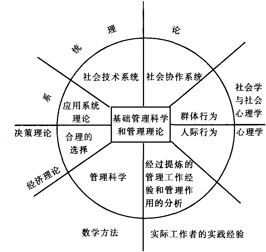 经营管理理论学派认为完整的管理学知识体系可以用图表示出来。经营管理理论学派既包括纯属管理理论的核心知识,即图中所示的基础管理科学和管理理论,同时还包括从其他学派或方法那里吸收过来的对管理工作最有用和最适当的知识。即图中圆圈内所包括的内容。