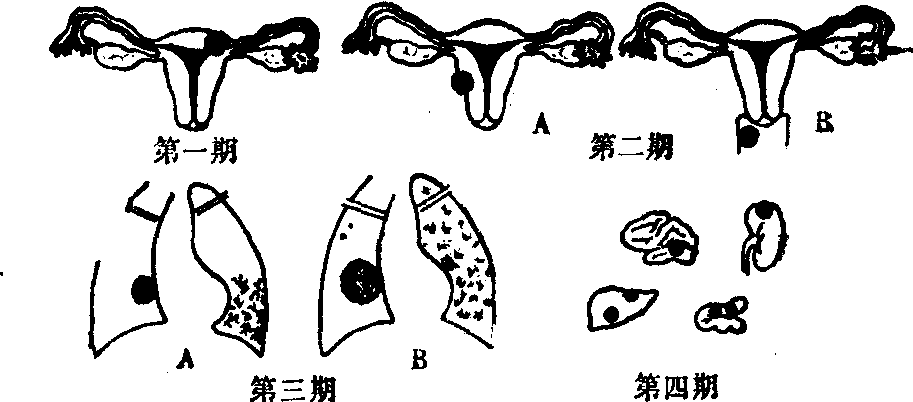 释义 | 绒毛膜癌是滋养细胞肿瘤的一种,是一种高度恶性的肿瘤。滋养细胞失去了原来绒毛或葡萄样结构,散在地侵入子宫肌层,造成局部坏死、出血,随血流播散到全身任何器官,治疗不及时死亡率较高。主要表现为葡萄胎、产后或流产后阴道不规则出血,子宫不恢复,较大而软。有的亦可出现一时性闭经,然后发生阴道出血。另外尚有转移症状。见“肿瘤学”中“绒毛膜癌”。 绒毛膜癌胚胎性绒毛膜的恶性肿瘤。最常见于子宫,与妊娠有明显关系。常表现为葡萄胎流产后、流产后或正常分娩后出现不规则阴道流血、咳嗽、咯血、腹痛、腹块等症状,尿与血中绒毛膜促性腺激素(HCG)水平升高,主要经血行播散,常转移到肺。治疗以化疗为主或化疗加手术治疗。见“妇产科学”中“绒毛膜癌”。 绒毛膜癌choriocarcinoma为一种高度恶性的滋养细胞肿瘤。其特点为增生的滋养细胞大片地侵犯子宫肌层和血管,并常有远处器官转移。肉眼观察,子宫不规则增大,柔软,表面有紫蓝色结节。镜下可见增生与分化不良的滋养细胞,排列紊乱,无绒毛结构。主要经血行播散,最常见的转移部位为肺,其次为阴道,外阴和脑部。 绒毛膜癌 绒毛膜癌绒毛膜癌是一种高度恶性的滋养细胞肿瘤,简称绒癌。绝大多数继发于正常或不正常妊娠之后,但亦有少数发生于未婚或绝经后妇女,且常和卵巢恶性肿瘤同时存在,这两种情况虽然在形态上很少差别,但在生理特性及临床表现均有不同,为区别起见,前者称“妊娠性绒癌”,后者称“非妊娠性绒癌”。根据统计,后者约占绒癌总数的0.5~1.0%。也有人报告在妊娠时即有绒癌,称“直接绒癌”,但其存在尚有疑问。 绒癌及恶性葡萄胎的临床分期法示意图 第一期 病变局限于子宫(无转移) 第二期 病变转移至宫旁组织、阴道及附件(近处转移) A: 转移至宫旁组织或附件 B: 转移至阴道 第三期 病变转移至肺(远处转移) A: 棉球阴影直径小于3.0cm或片状阴影不超过一侧肺之半 B: 超过上述范围 第四期 病变转移至脑、肝、肠、肾等器官(全身转移) 由于无或有转移,转移少或多的预后不同,处理亦有差别,因之在明确诊断的同时还需确定临床分期,首都医院根据多年积累资料展示的病变发展过程,提出临床分期如下图,经实践证明有一定实用价值。图示。 诊断一经明确即应及时处理,过去主要采用手术切除子宫,疗效很差,以后加用放疗,虽在少数病例中可以取得较好疗效,延长生命,但对多数病例,疗效仍无显著改善。据国内外报道,死亡率均在90%上下。 自采用化学药物治疗后,绒癌的预后有了明显的改进。国内外报道死亡率已下降至20%上下。治愈患者经五年以上长期随访,很少复发,说明已经根治。 国外所用化学药物主要为氨甲喋呤(Methotrexate,MTX) 和放线菌素D(Actinomycin D),国内主要用6-巯基嘌呤(6-mercaptopurine,6-MP),5-氟脲嘧啶(5-flurouracil,5-FU),更生霉素 (Kengshengmycin K SM),溶癌呤(tisupurine AT1438)和消瘤芥(nitrocapha-ne,AT1258)。药物的用量和用法如下: 常用化疗药物的用法