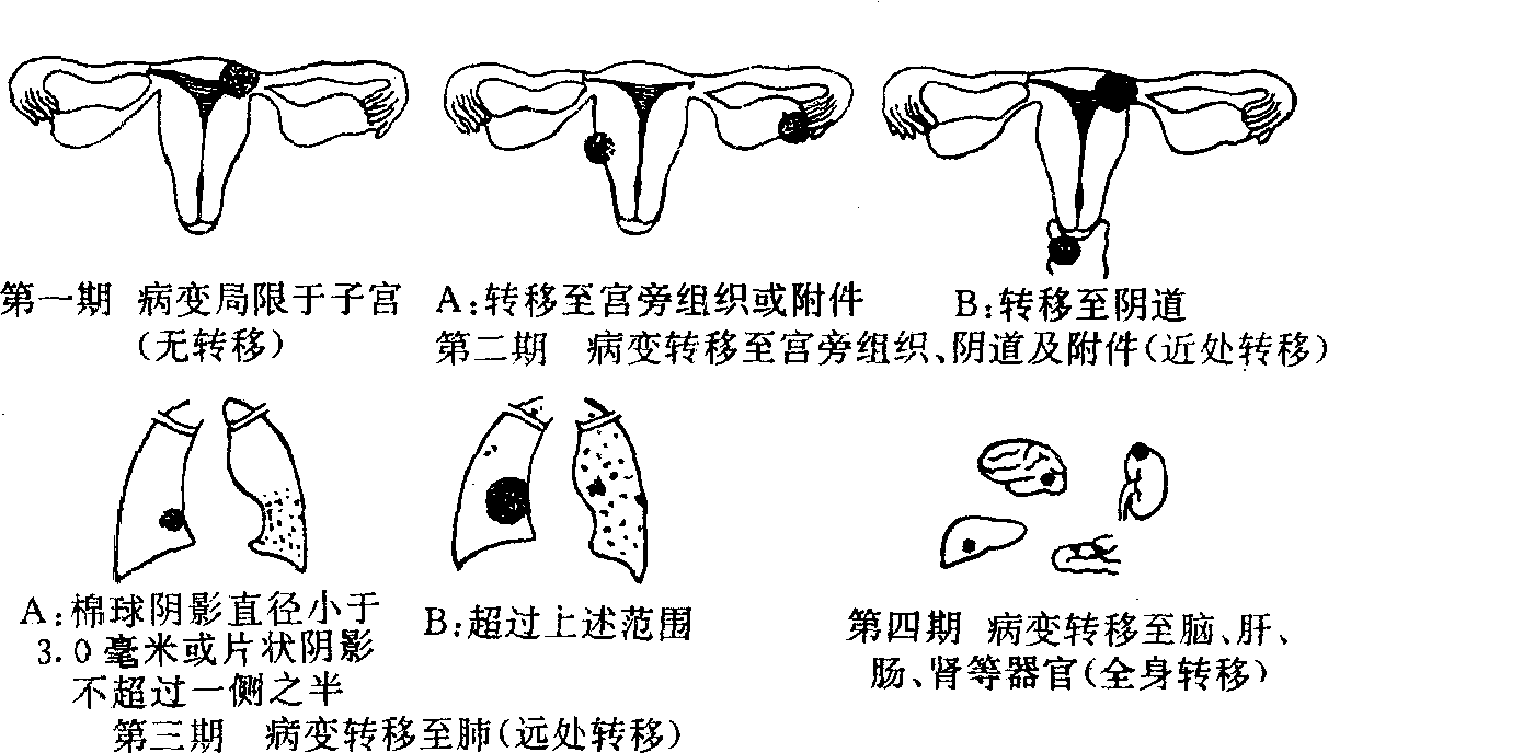 释义 | 绒毛膜癌的临床分期 绒毛膜癌的临床分期北京协和医院根据多年临床资料分析,提出绒癌的临床分期(见图7.4-3),以说明病变发展程度,在临床诊断及治疗中很有价值。 图7.4-3 绒癌及恶性葡萄胎的临床分期法示意图 ☚ 高度恶性的绒毛膜癌 7.5 子宫内膜异位症 ☛ |