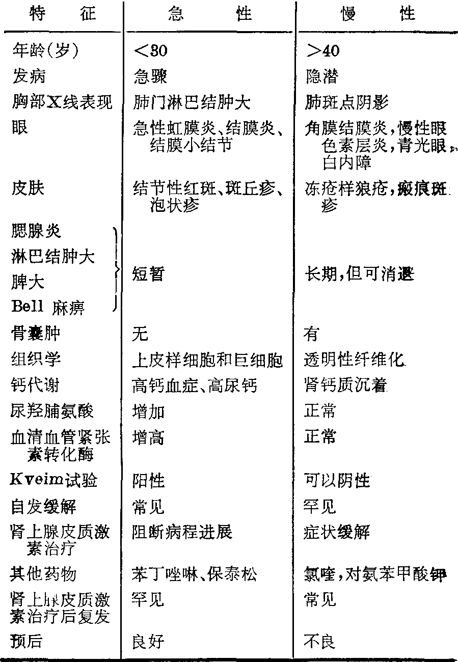 早期症状较轻或无任何症状,仅于胸部X线检查偶然发现肺门淋巴结肿大。急性期常有发热、体重减轻、乏力、不适、关节痛、咳嗽等。纵隔及浅表淋巴结肿大。皮肤结节性红斑常见于面部、颈部、肩部和四肢。轻型病人可在数周或数月内自然消退,或遗留肺部纤维性病变,预后较好。另有一部分病人病情倾向于慢性发展,侵犯身体多个器官及组织,发生广泛性肺纤维化、肺气肿等,预后不良。病情可分为急性和慢性型,其临床特点见表。