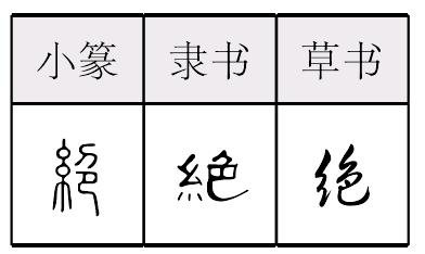 jué表意,小篆从糸、刀、卪(jié),卪指断绝,表示以刀断丝,隶定为“絶”。本义为断绝,引申为穷尽、(水平、程度)达到极点的、副词(相当于“极、最、无论如何”)等。《简化字表》类推简作“绝”。 【辨析】 ❶绝/截/断 这三个字都有截断义,读音相近,是同源字。 ❷绝/决见210页“决”。 |