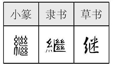 jì繼,表意,从糸从 (jì),糸为丝,有系连义, 是 (jué)的反文, 为断丝, 指连接在一起的丝,另加糸表示连接断丝,本义为接续,引申为继续、延续、继承、后续的、副词(表示紧随某一情况或动作之后)等。汉代俗字作“継”,据草书楷化;《简化字表》进一步类推简作“继”。 【辨析】 继/续 这两个字基本同义,但有微别:“继”一般偏指时间上相连,如“夜以继日、继世、继位”;“续”一般偏指空间上相连,如“绝长续短、狗尾续貂、续弦”。不过也有例外,如“首尾相继”的“继”转指空间,“子孙相续”的“续”转指时间。 |