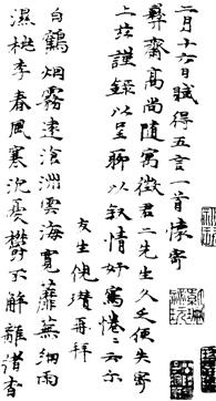 释义 | 倪瓒二月十六日诗帖 墨迹本。 元倪瓒书。纸本。小楷。 十五行,共一百八十七字。 此帖用笔瘦劲,结体宽疏,书风飘逸清丽,无烟火气。其上钤有‘秘玩’、‘紫珊秘玩’、‘兰陵武子珍藏’、‘武子’等鉴藏印。 《雍睦堂法书》中曾影印。 |